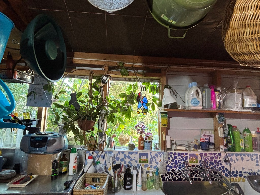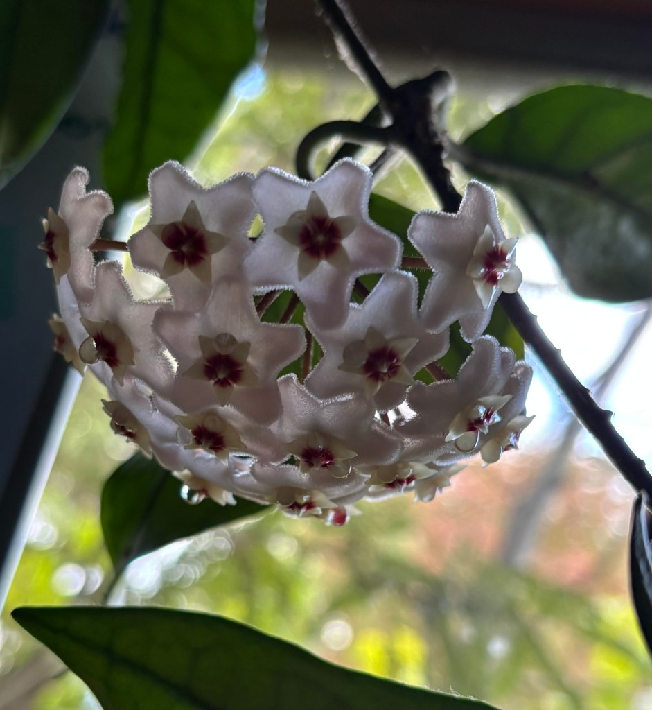 There’s a sweet honey scent in the garage; the hoya is flowering. Its flowers are sometimes called porcelain flowers, which seems apt as they hardly look real. There are three clusters of flowers this summer. You can see nectar dripping from the centre of each flower.
