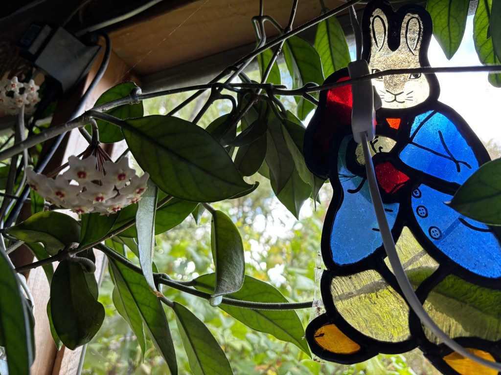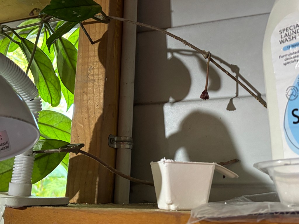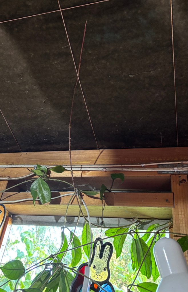 The hoya remains on the laundry side of the garage where it seems to be thriving beside the window, growing in and out of electrical cables and the laundry stuff. I try to remember to water it, feed it occasionally and wipe the leaves with Conqueror Oil sometimes. When it threatens to spread itself around the garage I cut it back but, undeterred, it sends out new tendrils with ambitious intent.