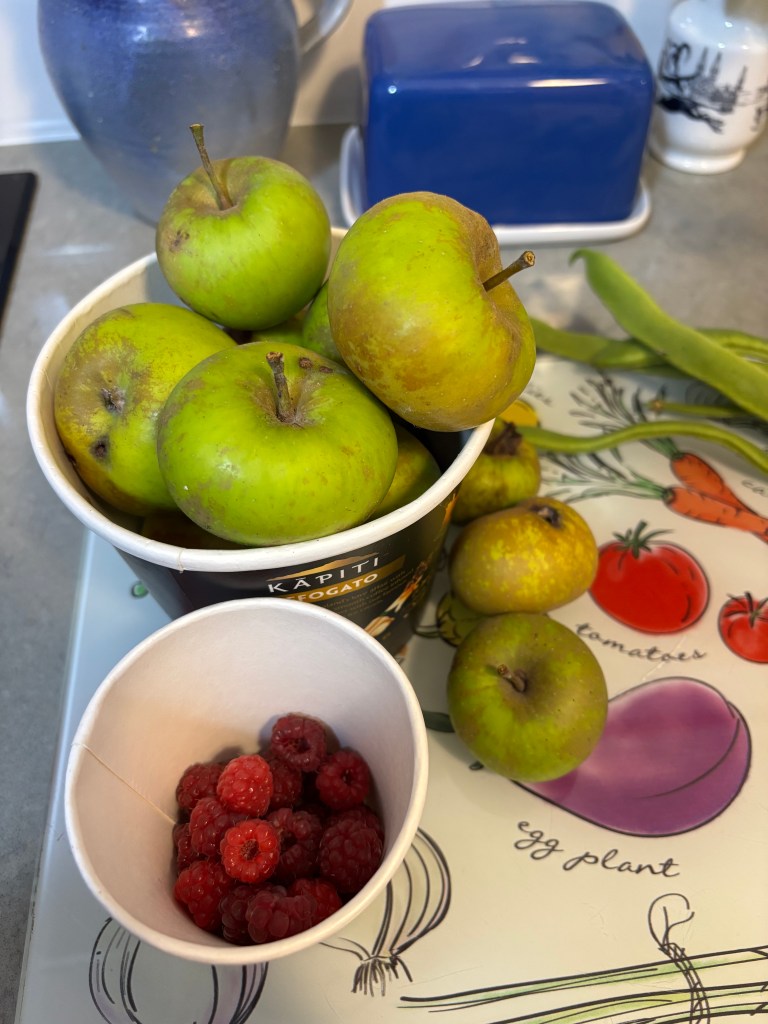 Tasty red tomatoes for bolognese sauce and soupSpinach, beans, zucchini and parsley are welcome additions to our dinnersSturmer apples, autumn-fruiting raspberries and late season runner beans