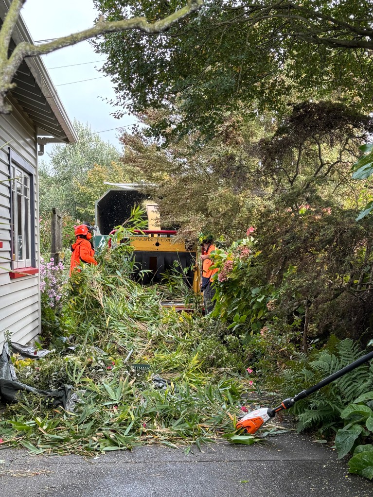 A piwakawaka flitted about, undeterred, as they worked. Catching dislodged insects, I suppose. One of the arborists said that only about 6% of fantails are of that variety: dark and slightly larger than the others. Every day’s a school day!