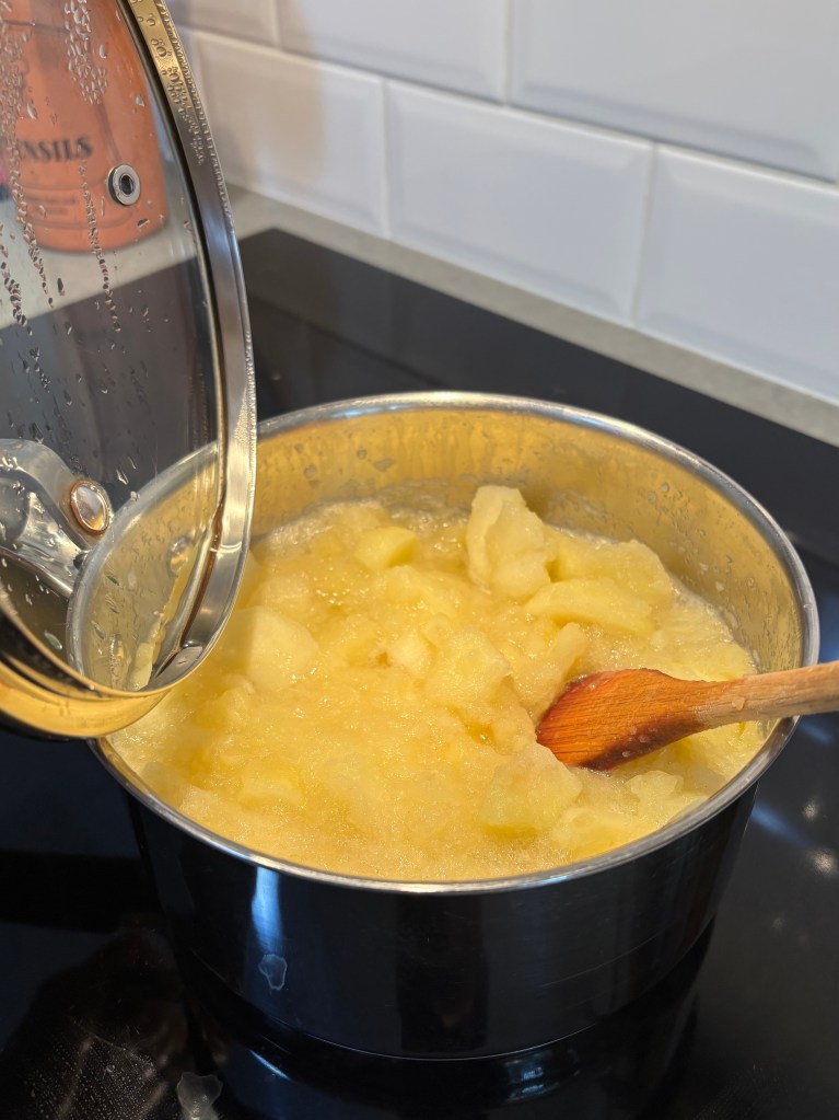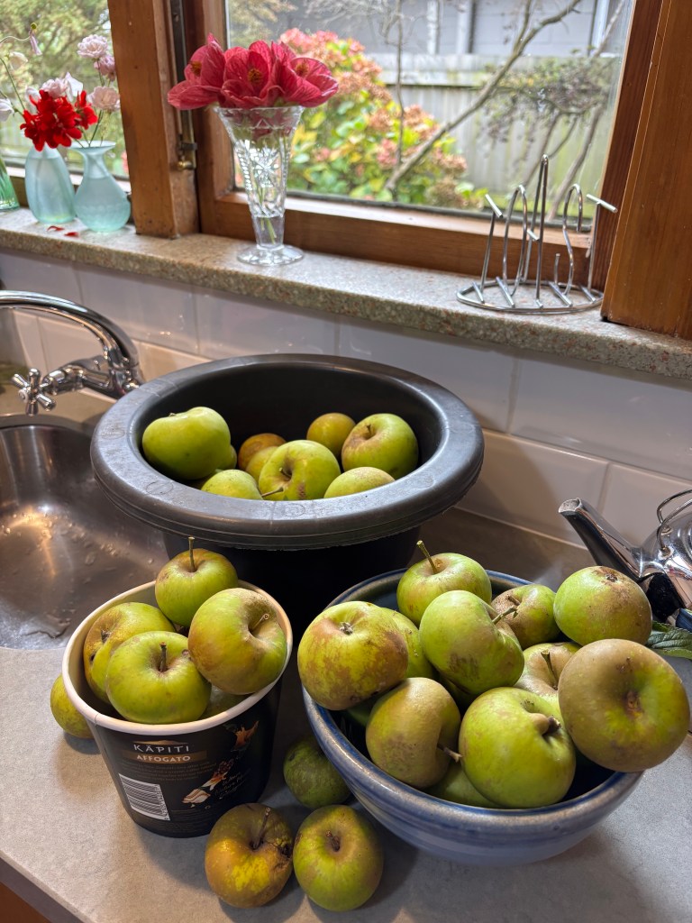 During the apple tree’s pruning, lots of apples were dislodged which I popped into a pot. They seemed to instantly turn into puree. No sugar added. I did put some lemon juice in – from lemons dislodged from their tree.
