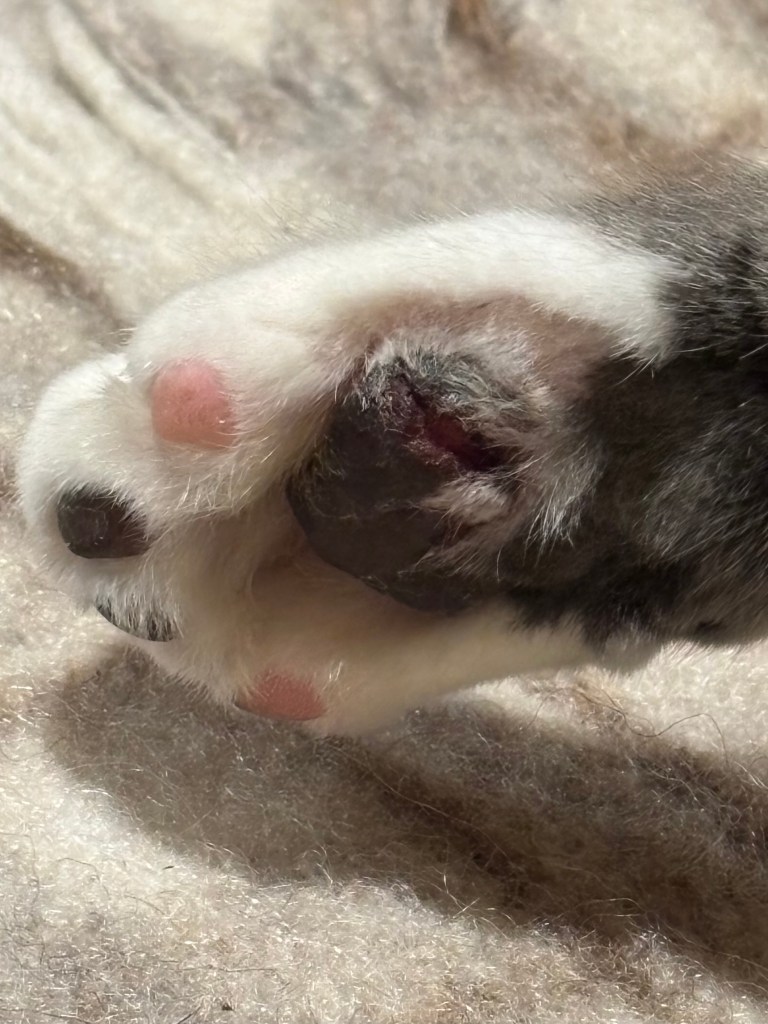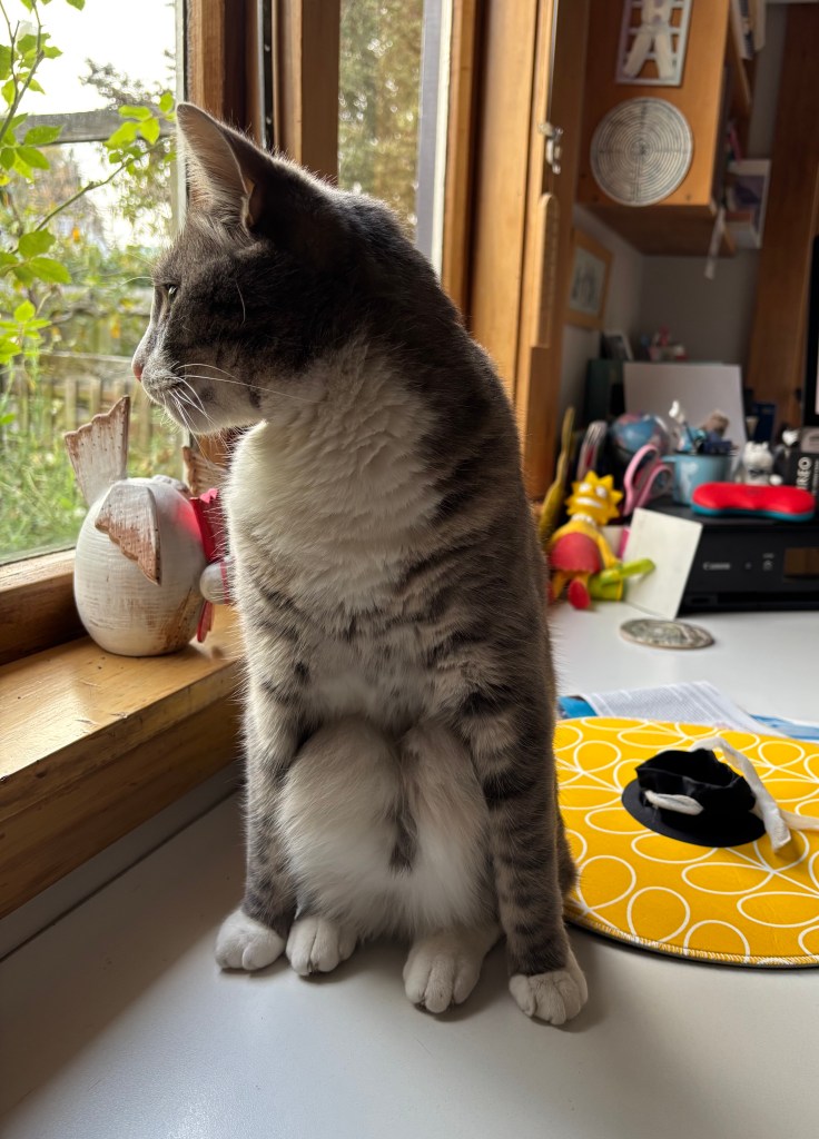 Felix has just come in with that triumphant trot he has when he’s pleased with himself. He’s licking his lips – has he polished it off?