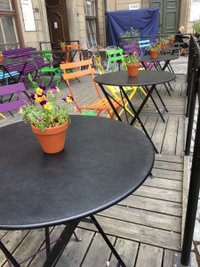 On this Stockholm cafe’s tables, the violas match the chairs.