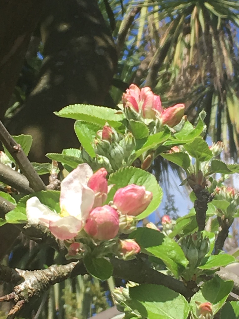 Old secateurs make a crooked line-up. Hanging to the side of the door below the weed hooks, those iron claws are an old pair of crampons from Emei Shan, China, on which my companions and I slid on ice as we attempted to climb the mountain (unsuccessfully – the crampons wouldn’t stay on). The mosaic below is made of bits and pieces of tile.