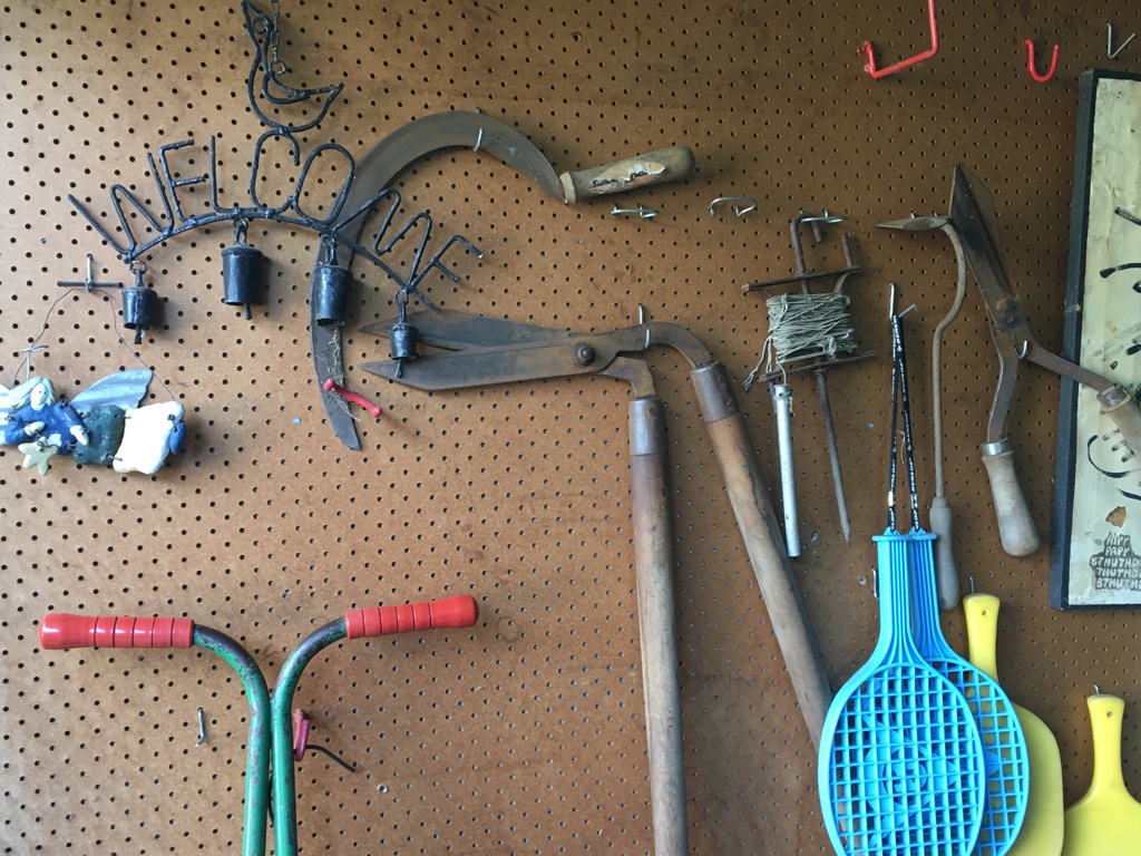 Then there’s the museum of Dad’s old tools on a peg board – alongside the anachronistic swing ball bats which have been idle since the pole broke.