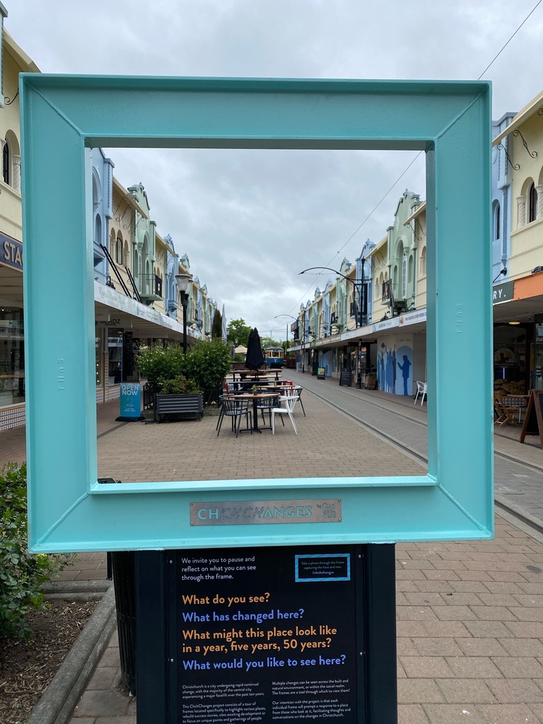 Gap Filler has put frames around the city to encourage us to look. On my way for an eye test, appropriately, I came across this frame in New Regent Street. I took a photo looking down the street to an approaching tram, and another looking out of the street across Gloucester Street to Cathedral Junction.