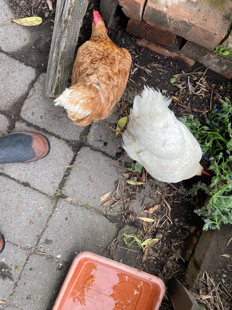If the chooks hear me moving a garden pot or bricks, or lifting the lid of the compost, they rush to see what comes to light. The wood pile, garden shed and pea straw attract their attention. I can barely discern what they are eating. They don’t seem keen on slugs, however, turning their beaks away when one is offered, but I have seen them pecking at snail shells. Maggots from around the chicken-poo bucket are an acceptable snack.