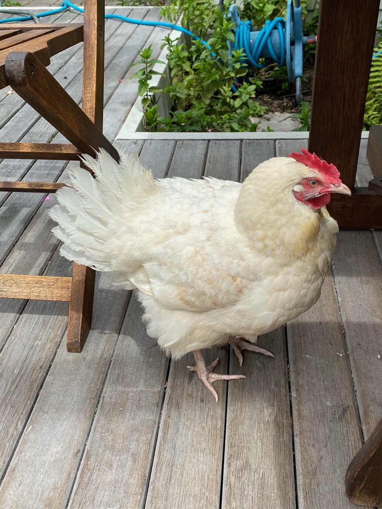 Popcorn is broody again. She is all fluffed up, giving the impression of an abundance of feathers.
