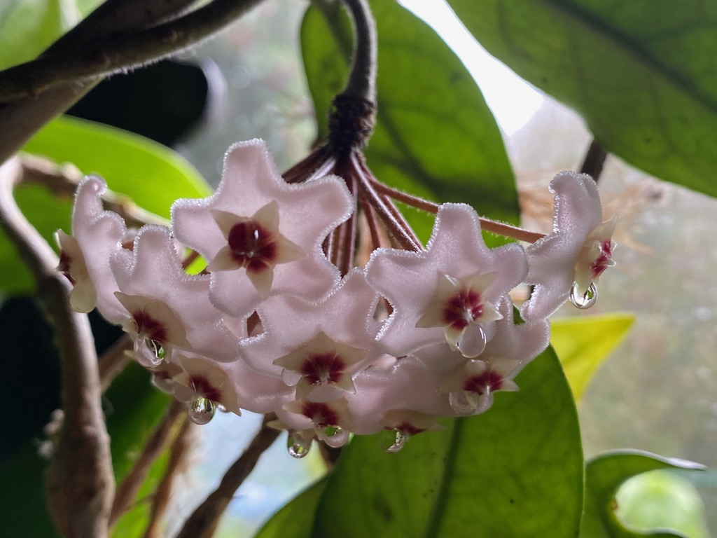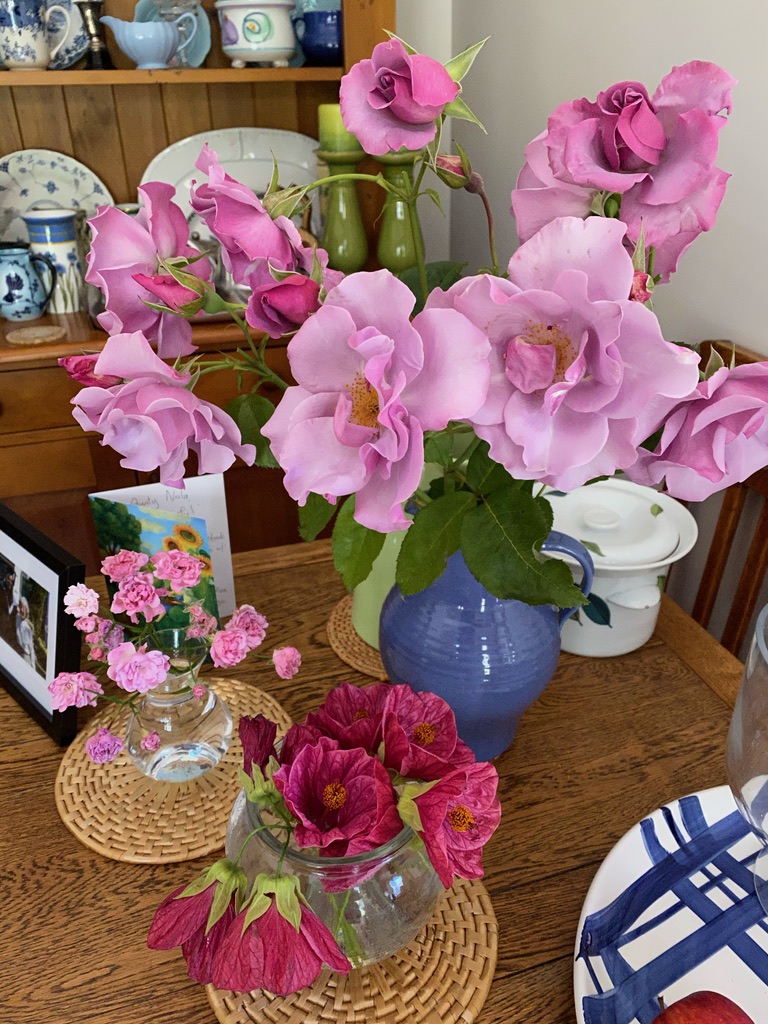 Yesterday’s ferocious nor’west wind threatened the second flush of roses, so I rescued this Blueberry Hill. These roses are all on one stem. The abutilon flowers were blown off by the wind.