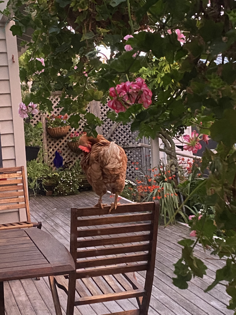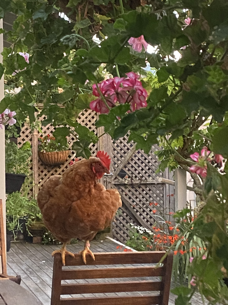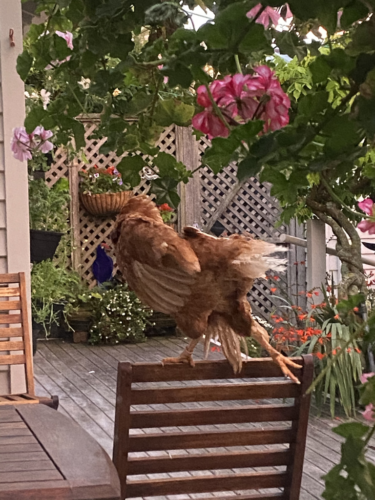 The sky was red at sunrise, and I caught this morning morning’s minion, kingdom of daylight’s dauphin, dapple-dawn-drawn…chicken… in her preening (apologies to G.M. Hopkins).