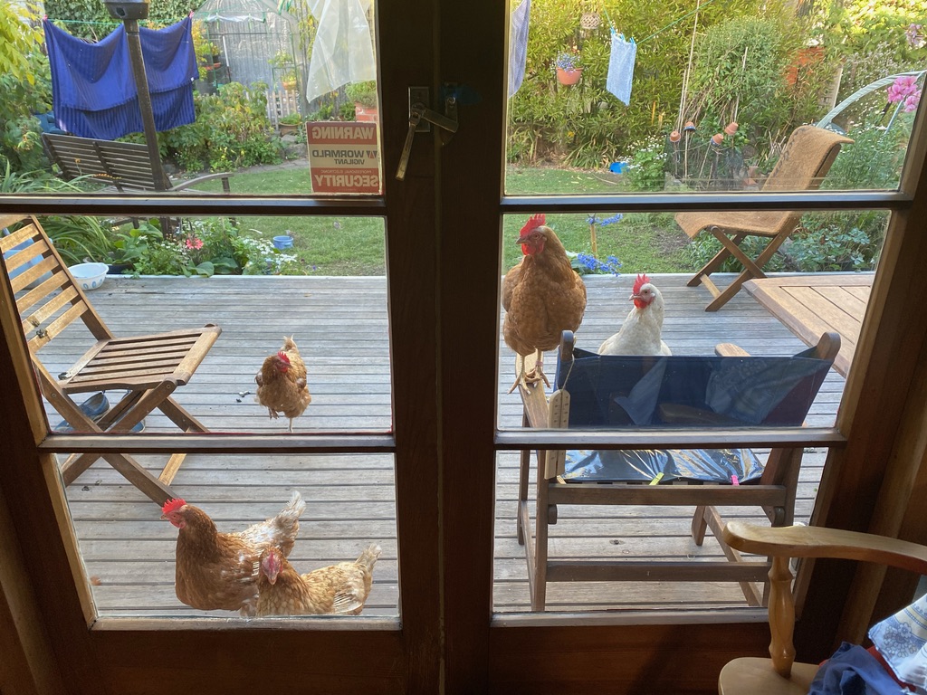 Now there are five chooks at my back door waiting for treats – or for a chance to sneak inside, perhaps. And more for me to do with ‘poop patrol’ and swabbing the deck. Only Dora and Popcorn get up on the outdoor furniture. The new chooks are far too polite.