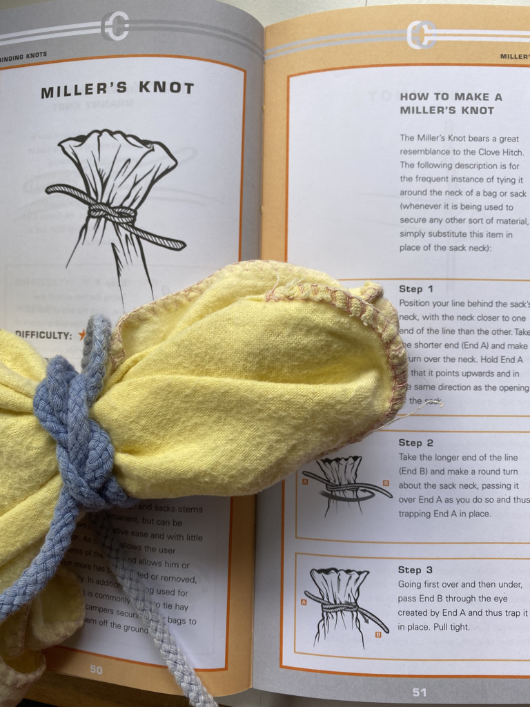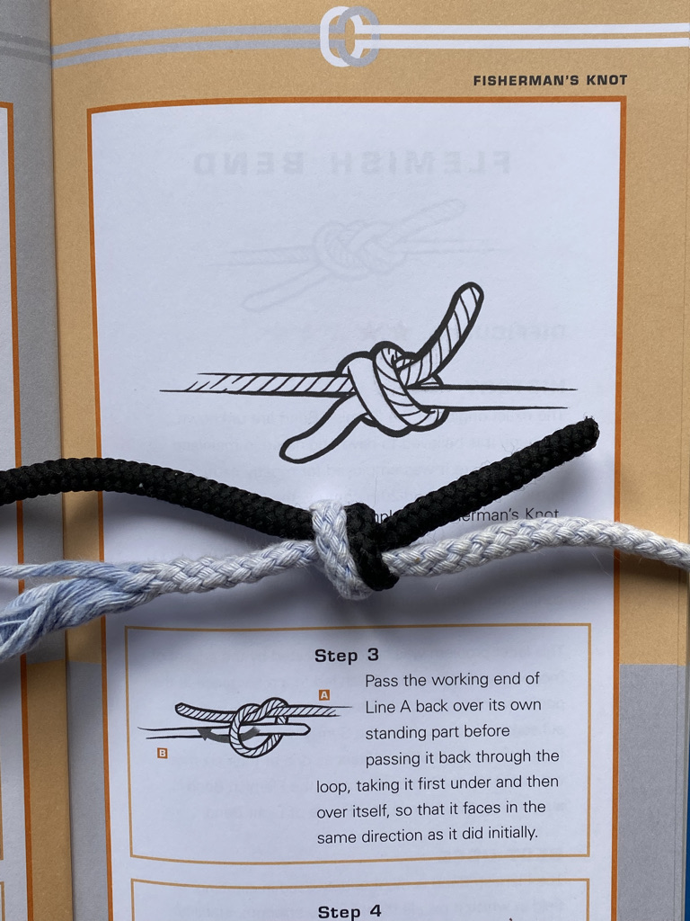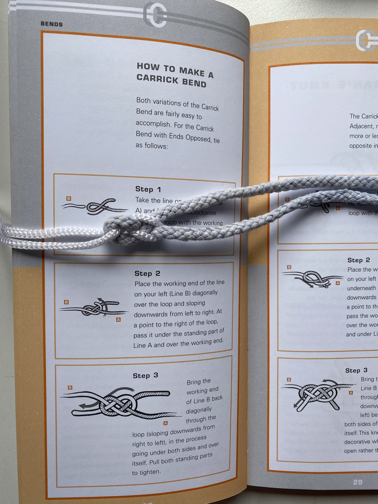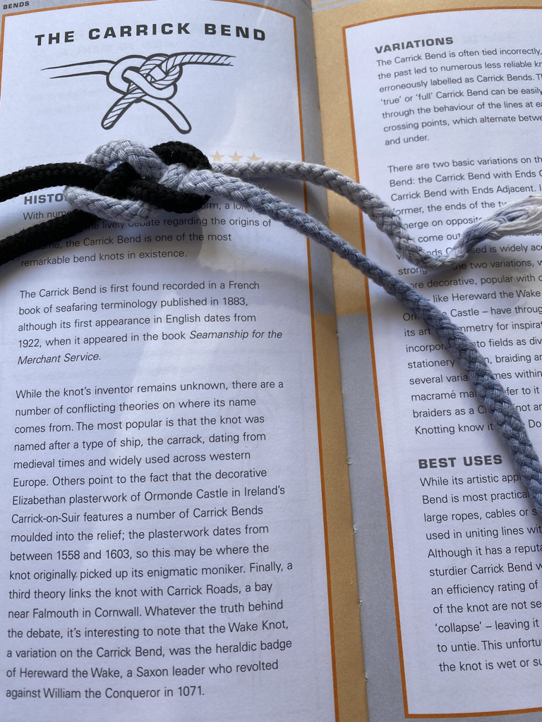 I find the Carrick Bend aesthetically pleasing – so I did it twice – and the Miller’s Knot looks useful. The book is Knots An illustrated practical guide to the essential knot types and their uses by Andrew Adamides, Arcturus Publishing Ltd, 2007