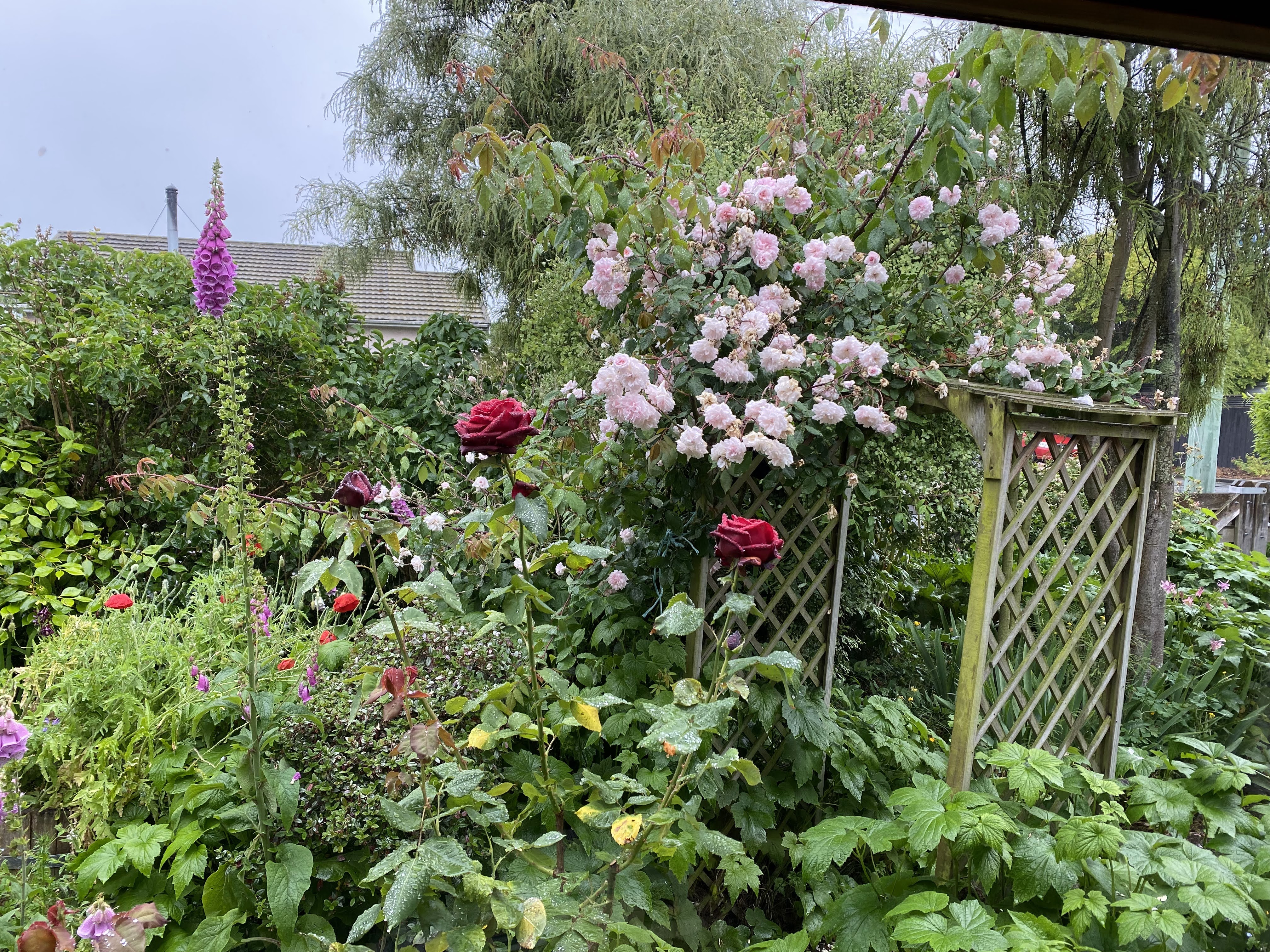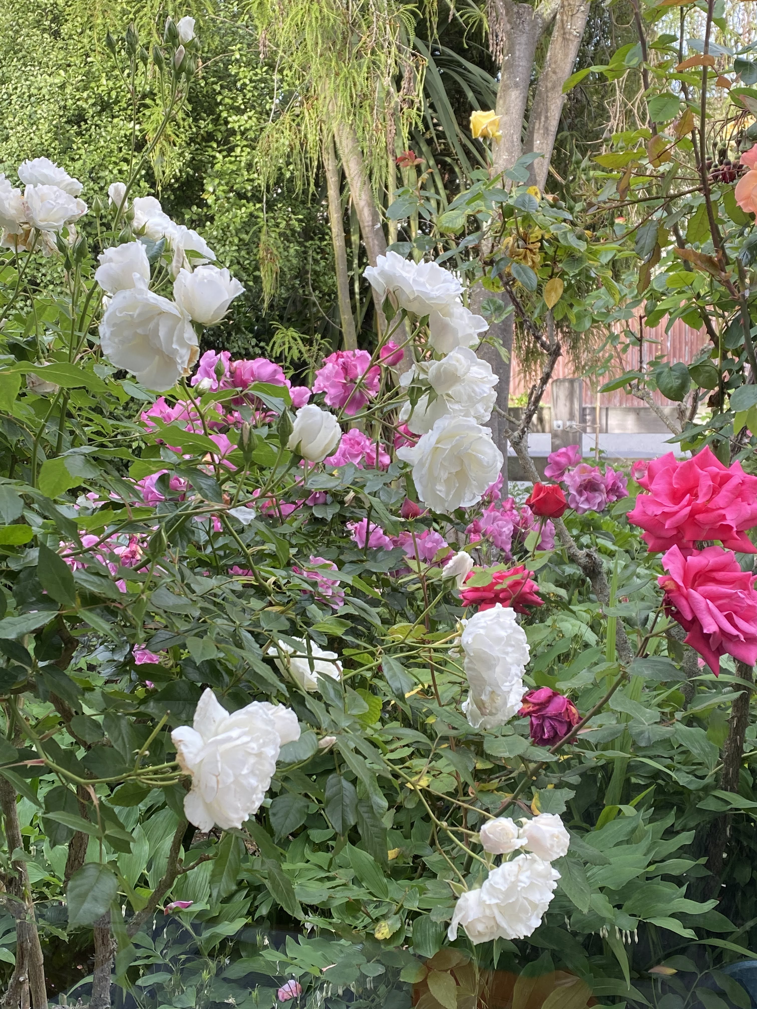 The title of this post alludes to Lyn of Tawa‘s chaotic colour schemes. My gardening is similarly chaotic: there is no planned colour scheme here. In fact, I took a step backwards on opening the blind on Sunday morning. I’ve been away for six days and the growth in the garden is overwhelming.