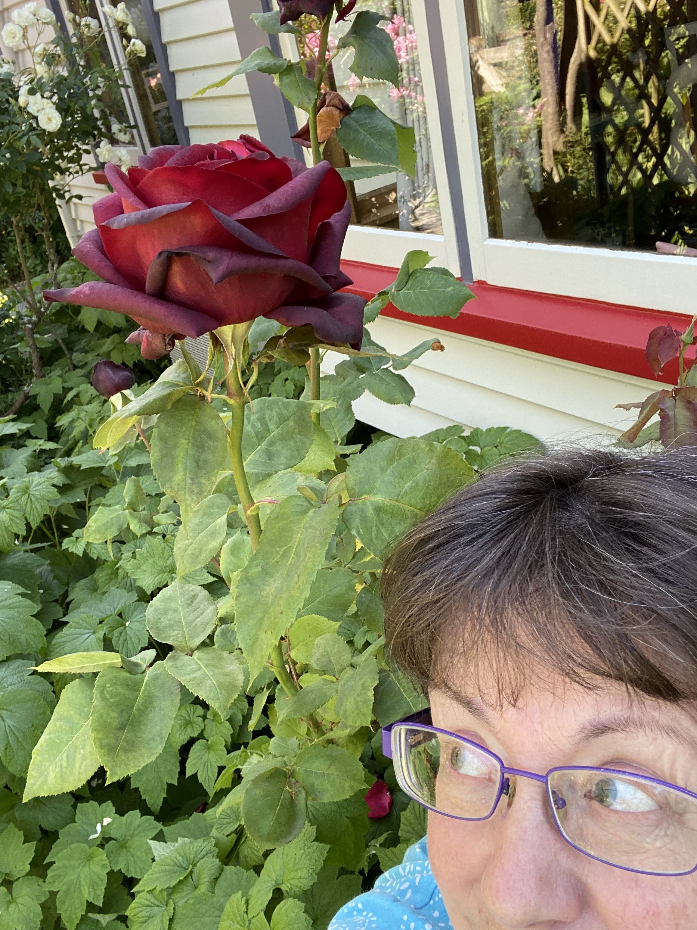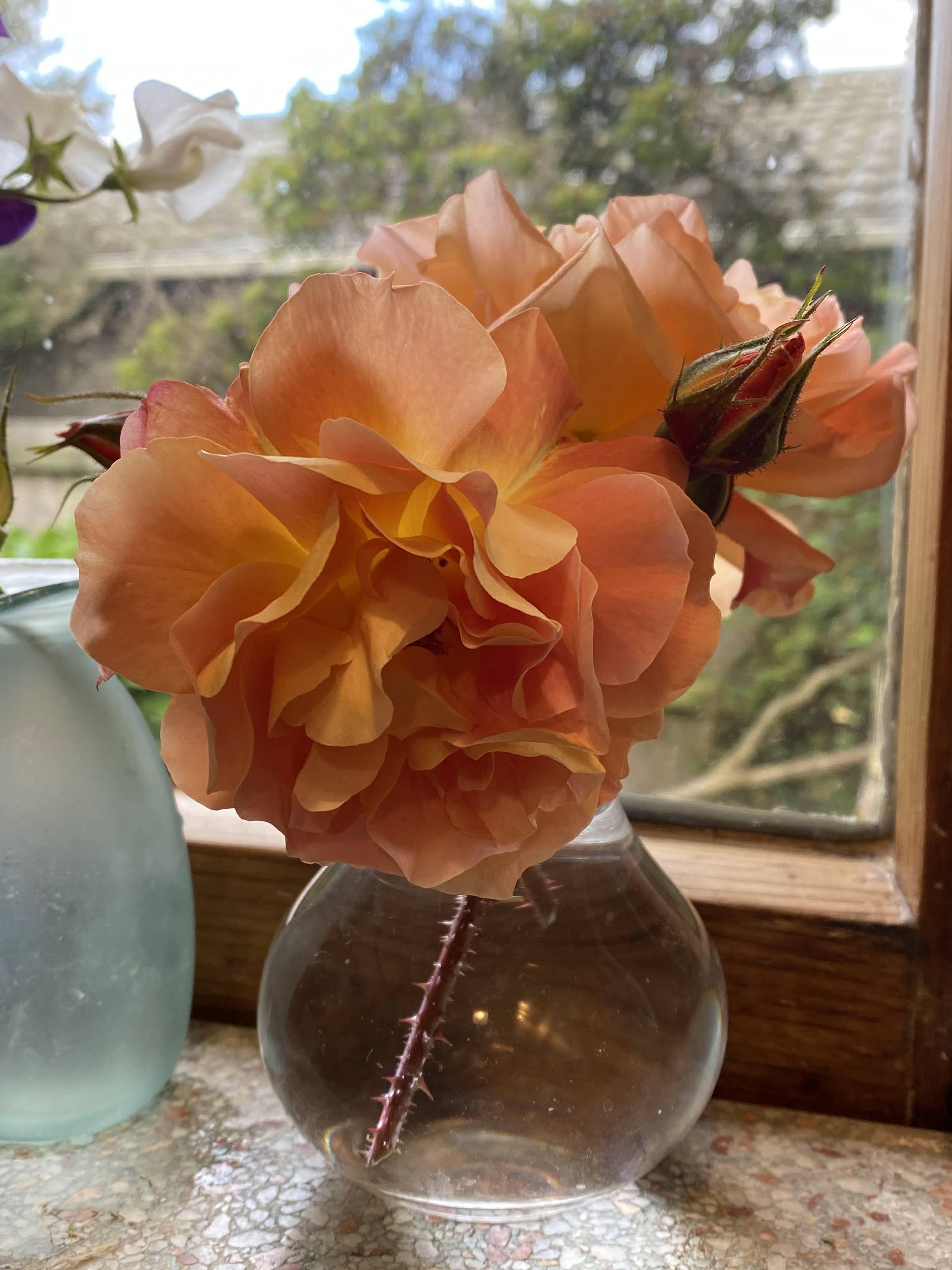 I can pick flowers with no impact on the visual explosion. Some of these flowers were rescued from branches broken by the wind. The sweet peas are a summer favourite. The red roses in the vase are Precious Platinum from a plant transplanted from my mother’s former house.