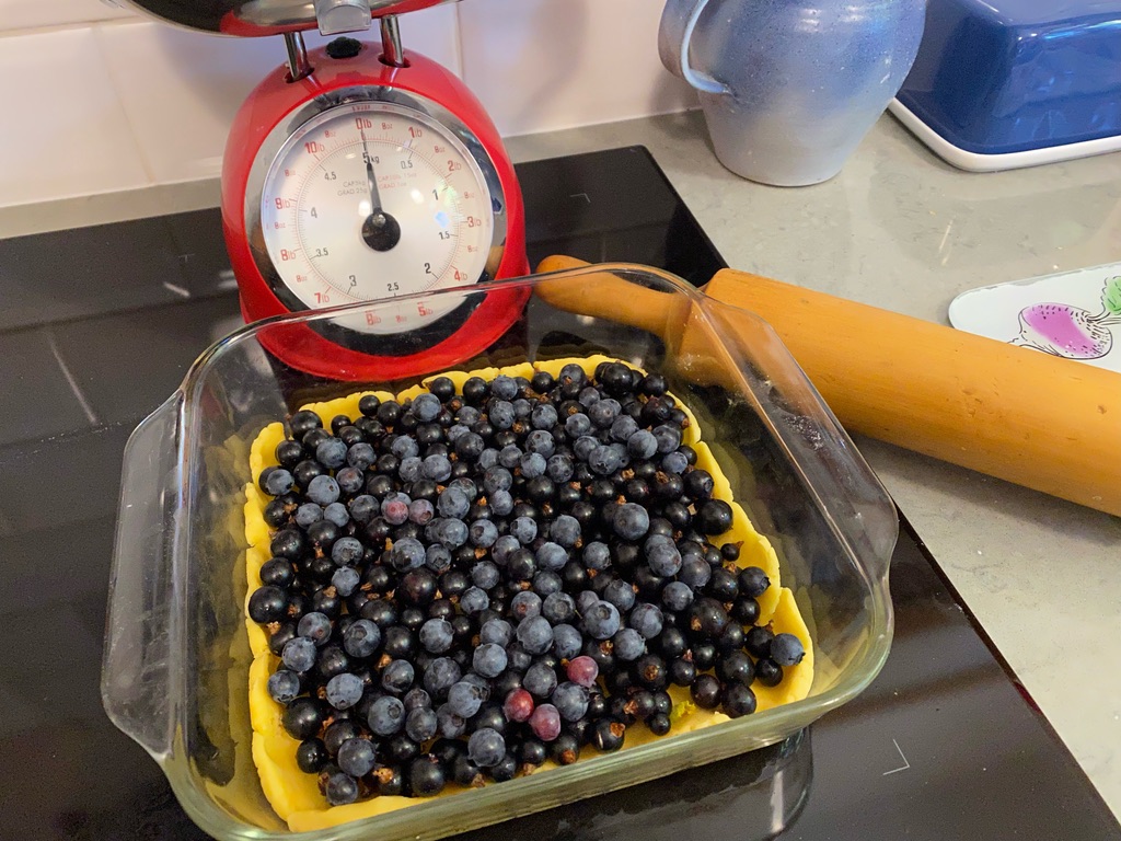 Then I looked for a more interesting recipe and found one for Blackcurrant and vanilla cream tart. This has a pastry base and a filling of egg yolk, caster sugar, vanilla, and double cream. I used half yoghurt and half cream which probably added to the tartness of the fruit. Delicious.