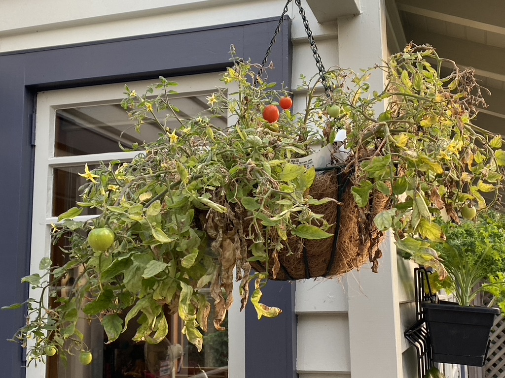 The tomato plants in a hanging basket (another of the many strategies to protect plants from the chooks) are still producing flowers and fruit.