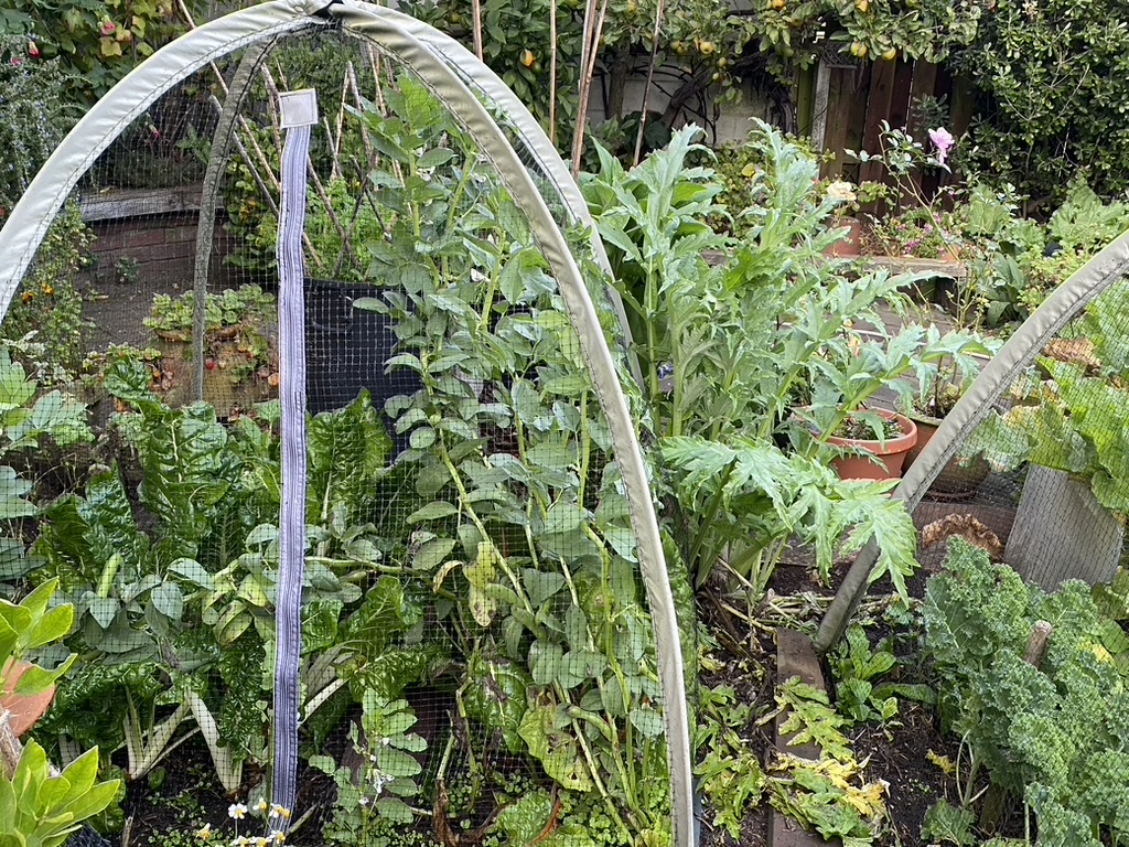 Chrysanthemums and broad beans among the rainbow chard are flowering. The bean plants popped up all by themselves when I followed advice to ‘chop and drop’ the old, finished plants. Another of many examples of plants in the garden with the will to flourish.