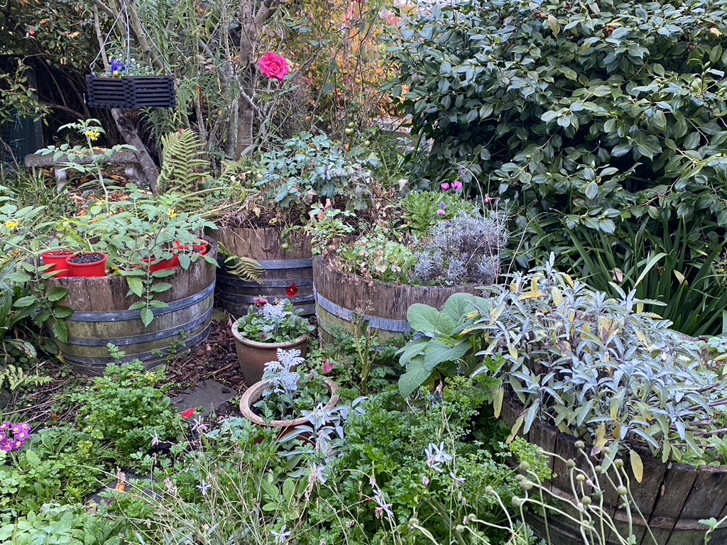 I look at work I have done to tidy up the tired late-summer growth – bulbs and winter colour in pots – and note new growth on the tomatoes, a fox glove stubbornly emerging from the side of a barrel, and buds on the camellia (it is flowering on the other side).
