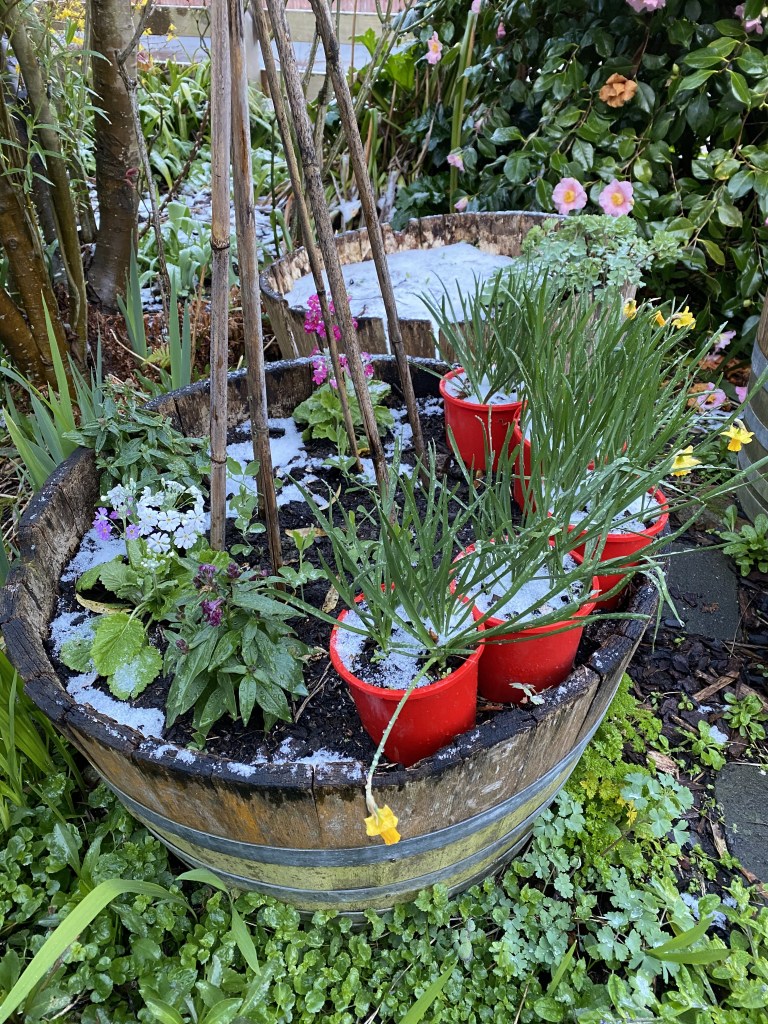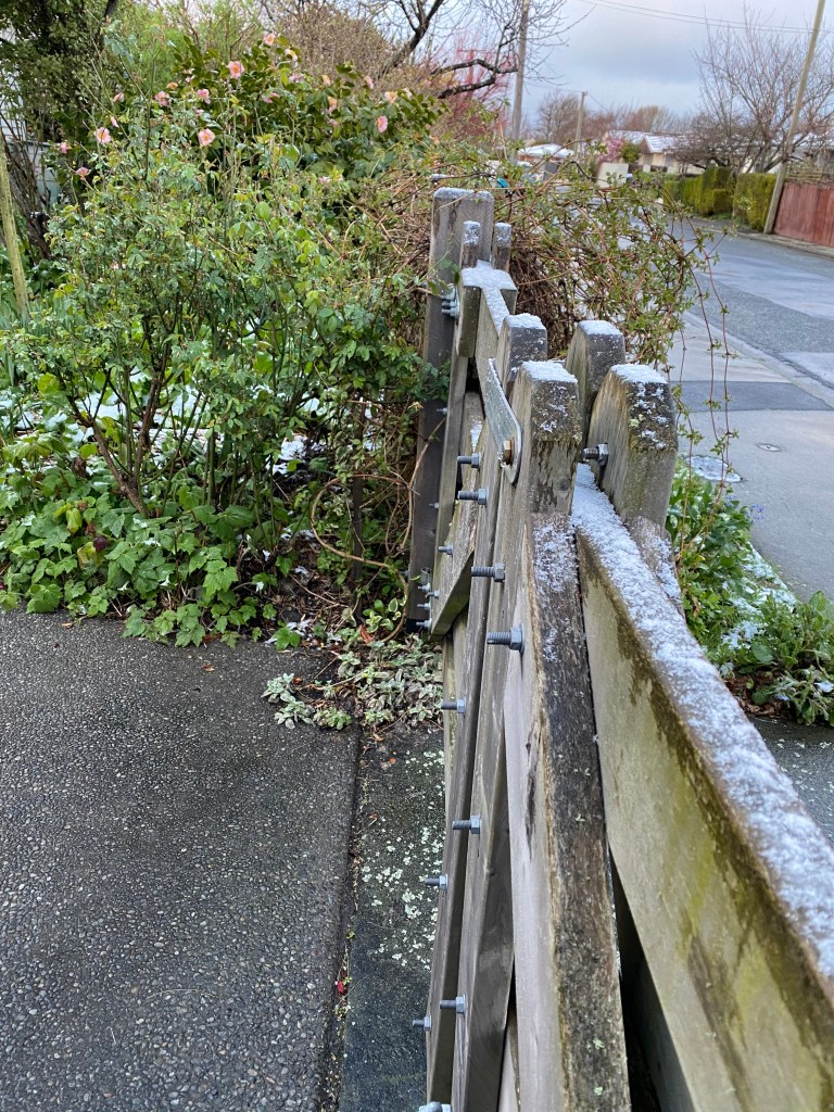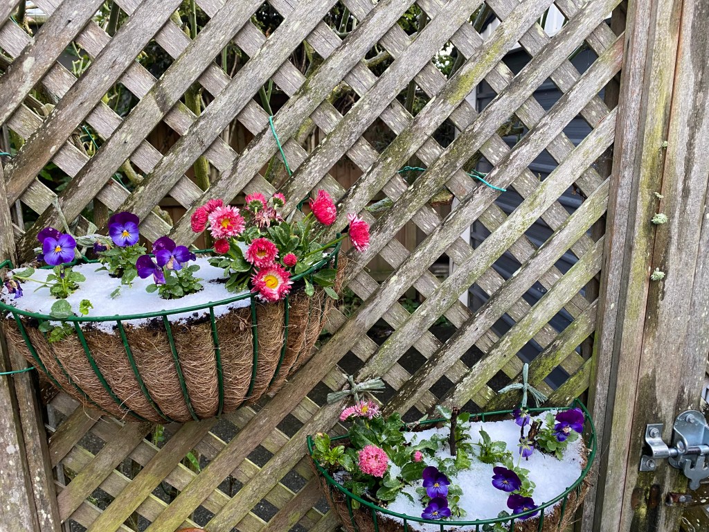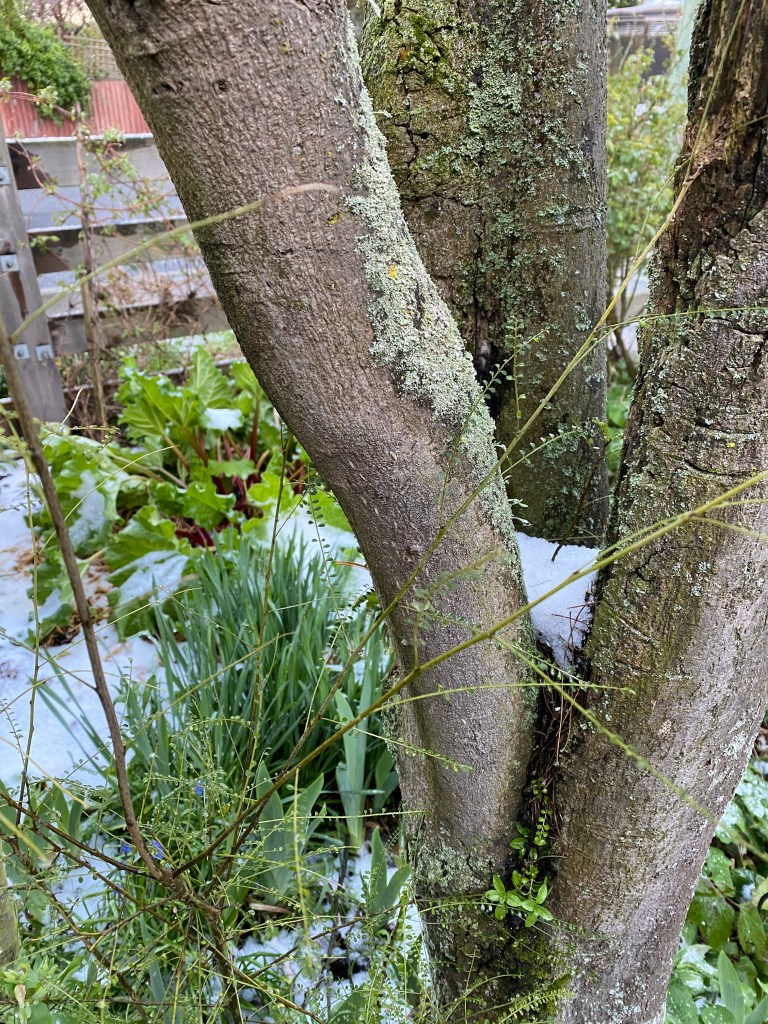 It was a novelty to wake up to a light coating of snow this morning. Mabel was not keen to put her feet in the snow on the deck. I carried her across to join the others for breakfast on the lawn before she missed out. Chickens feet are warm, in case you’ve wondered – or never thought about it. Mabel (second from the left) was warm and her feathers soft and silky.
