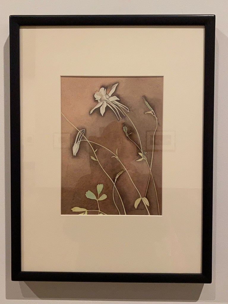 Another area featured work from the gallery collection curated to show the artists’ use of light. I entertained myself by trying to identify the artists before reading the plaques. This one I didn’t pick as a Rita Angus, but I enjoyed the subject: an aquilegia. Rita Angus’s Goddess of Mercy is a favourite which was also in the exhibition. It is full of light and colour, so this muted watercolour was a surprise and my appreciation of it was heightened by my own enjoyment – and irritation, sometimes – with aquilegias in my garden.