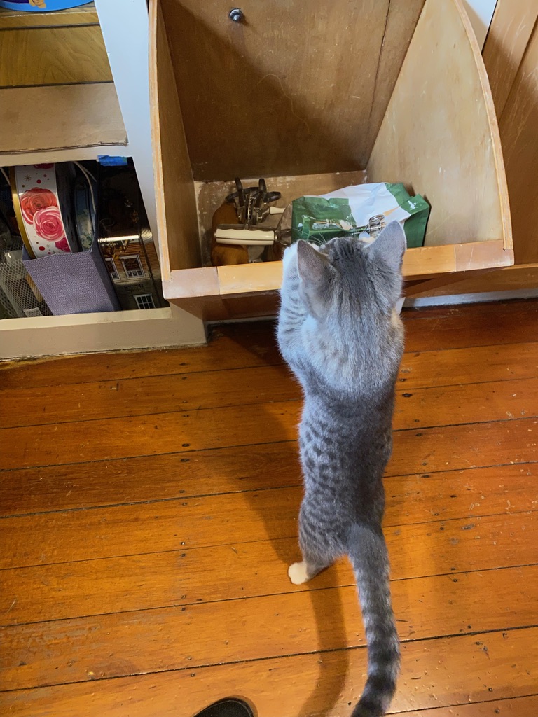 Exploring the cupboard and the flour bin was fun while I was baking this morning, until his reflection in the oven door and all those cats on the tea towel caught his attention.