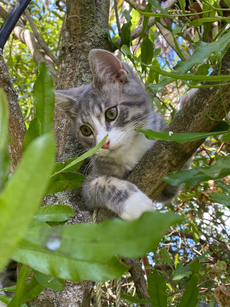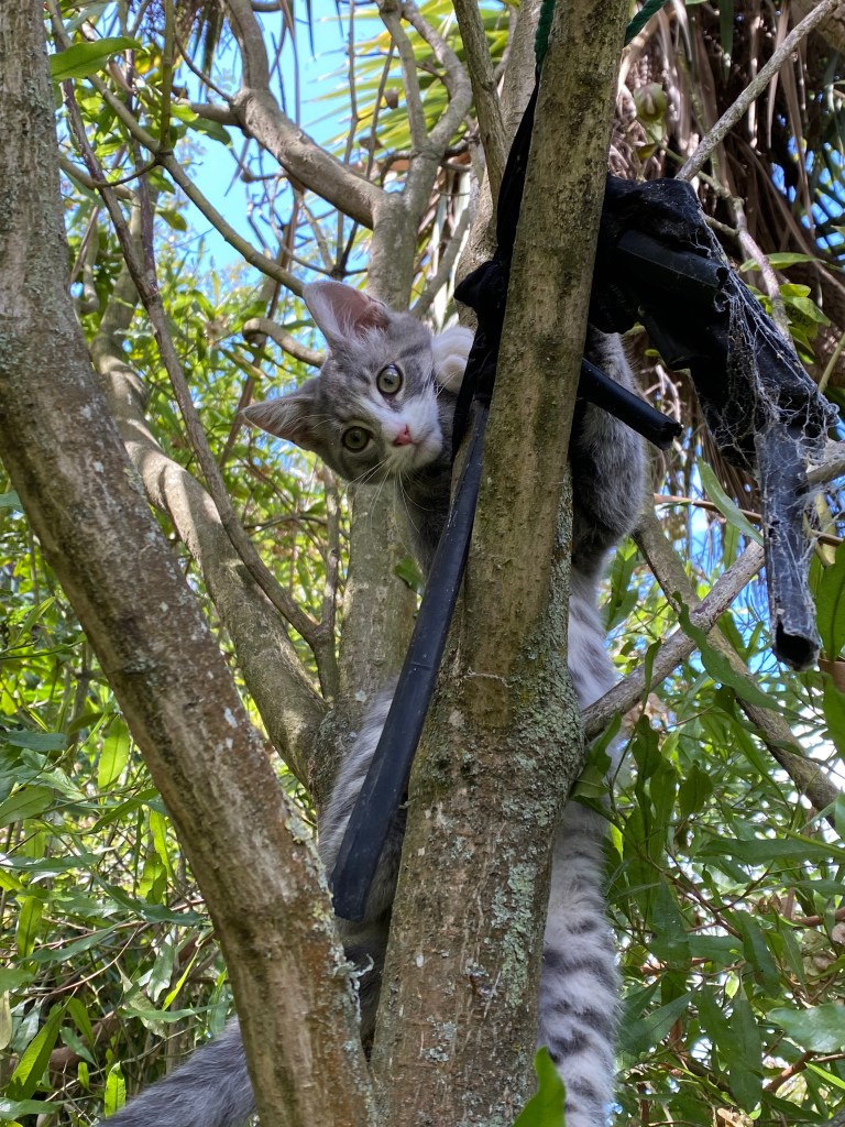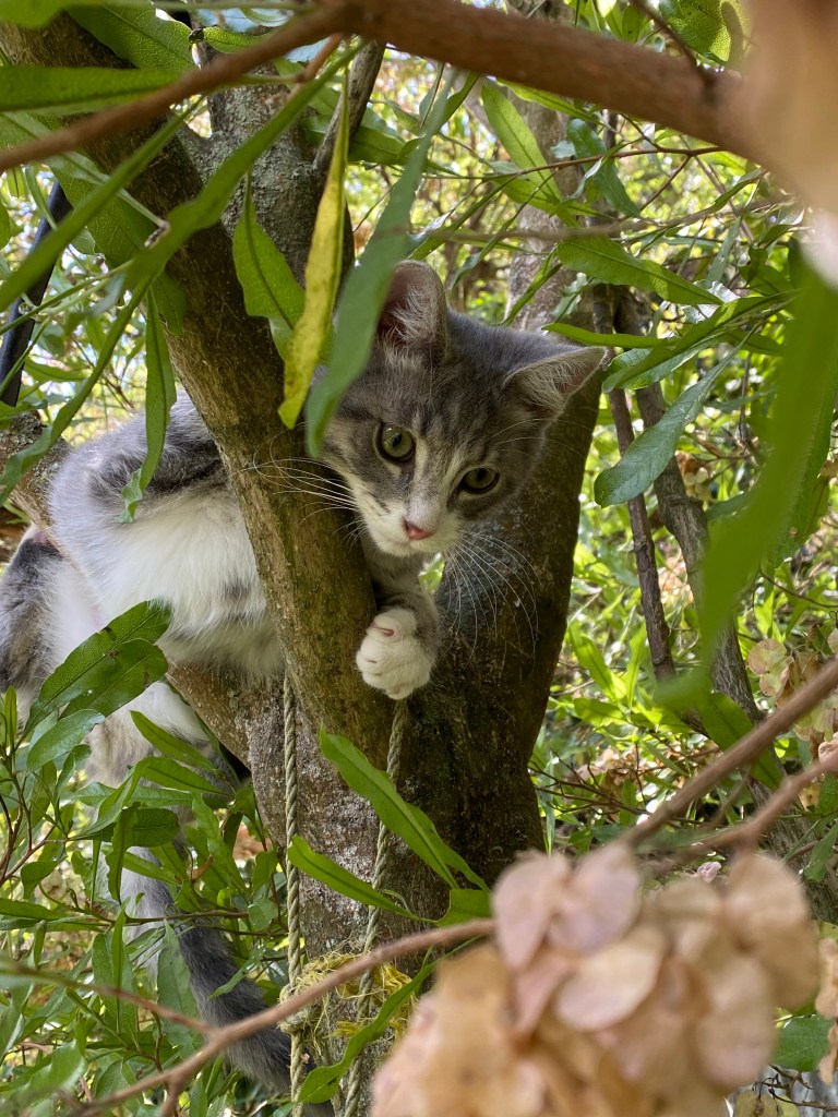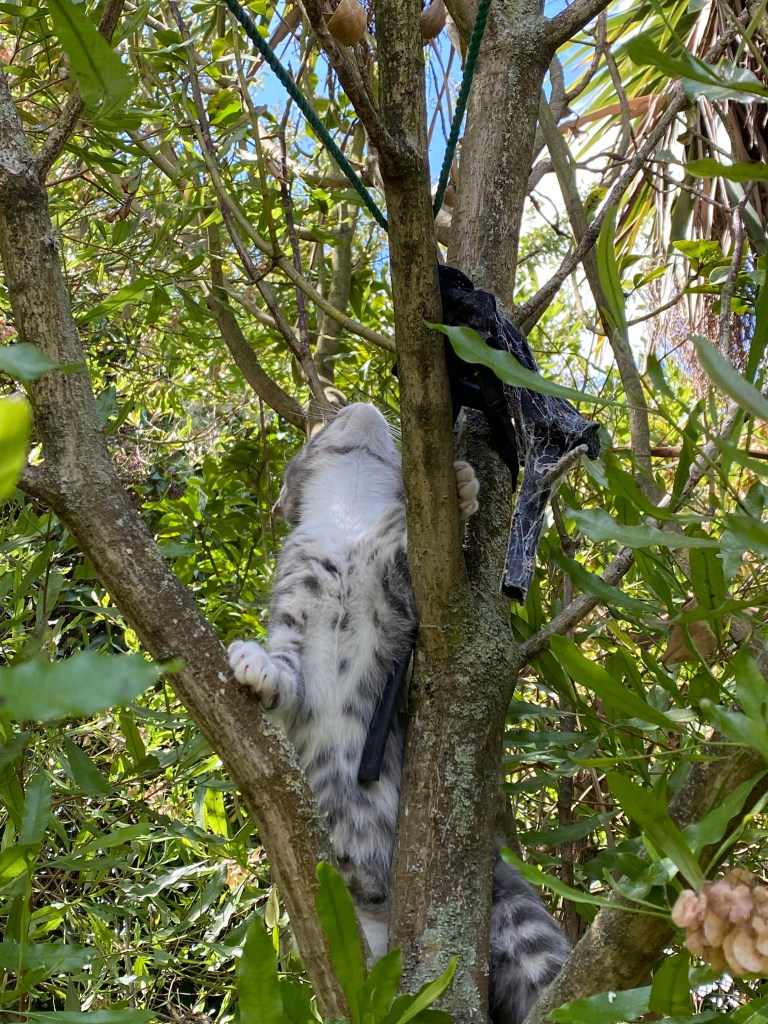 How to entertain Felix in the house became an issue. Particularly since he’d had more than just a taste of freedom, he was climbing trees! And he is growing bigger.