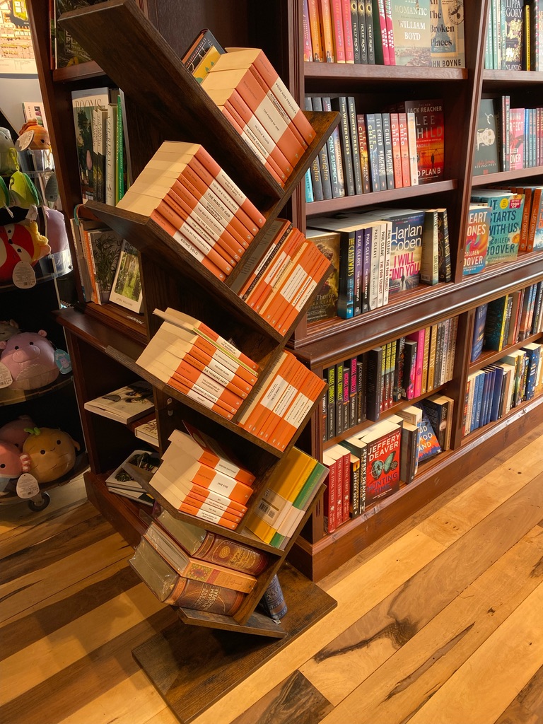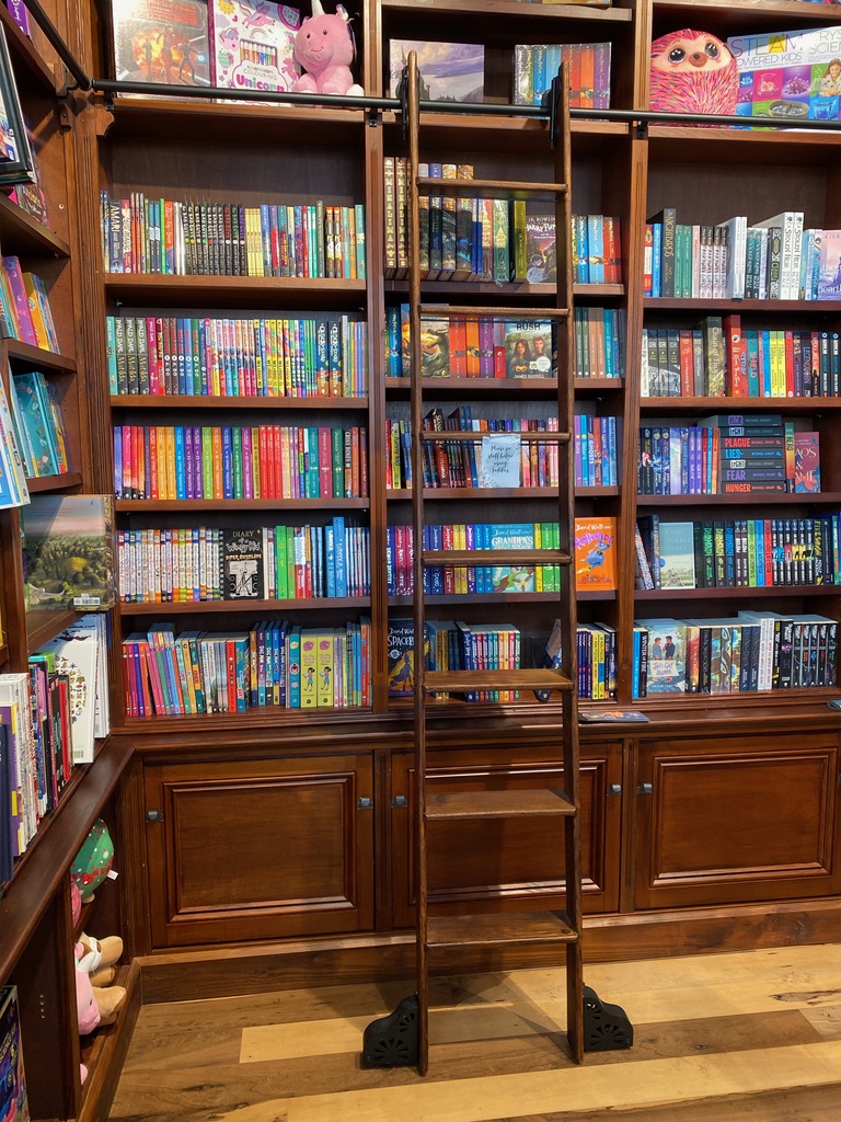 I found that the bookshop has two ladders. Other delights included a bay window with seat, a fireplace, interesting book shelves and a fabulously restored facade. And, of course, a vast selection of books, stationery, games, and a post office.