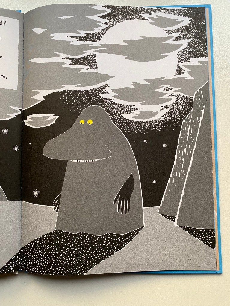 The Groke was sitting there. Her round little eyes reflected the glow, but otherwise she was just a large shapeless greyness…She went straight to the fire. And without saying a word she sat down on it. There was a sharp hissing sound, and the hilltop was wrapped in mist. When it passed away, no embers were to be seen. Only a big grey Groke blowing snow-fog about her.