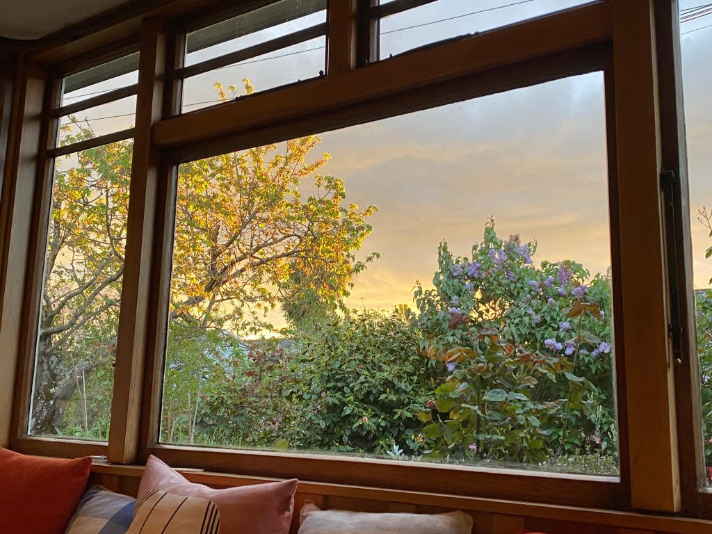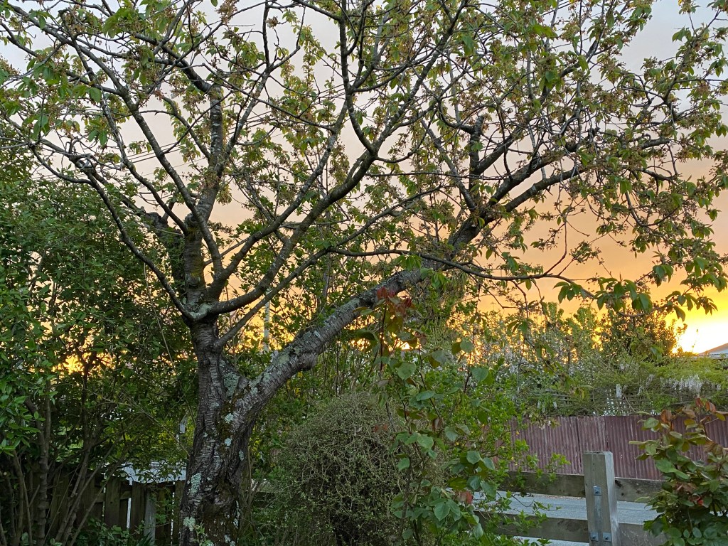 There’s an adjustment required to foreshortened views after the panoramic vistas of Wānaka. No mountains or lake, but we do enjoy the evening skies at home. Last night, the cherry tree turned golden as the sun set.