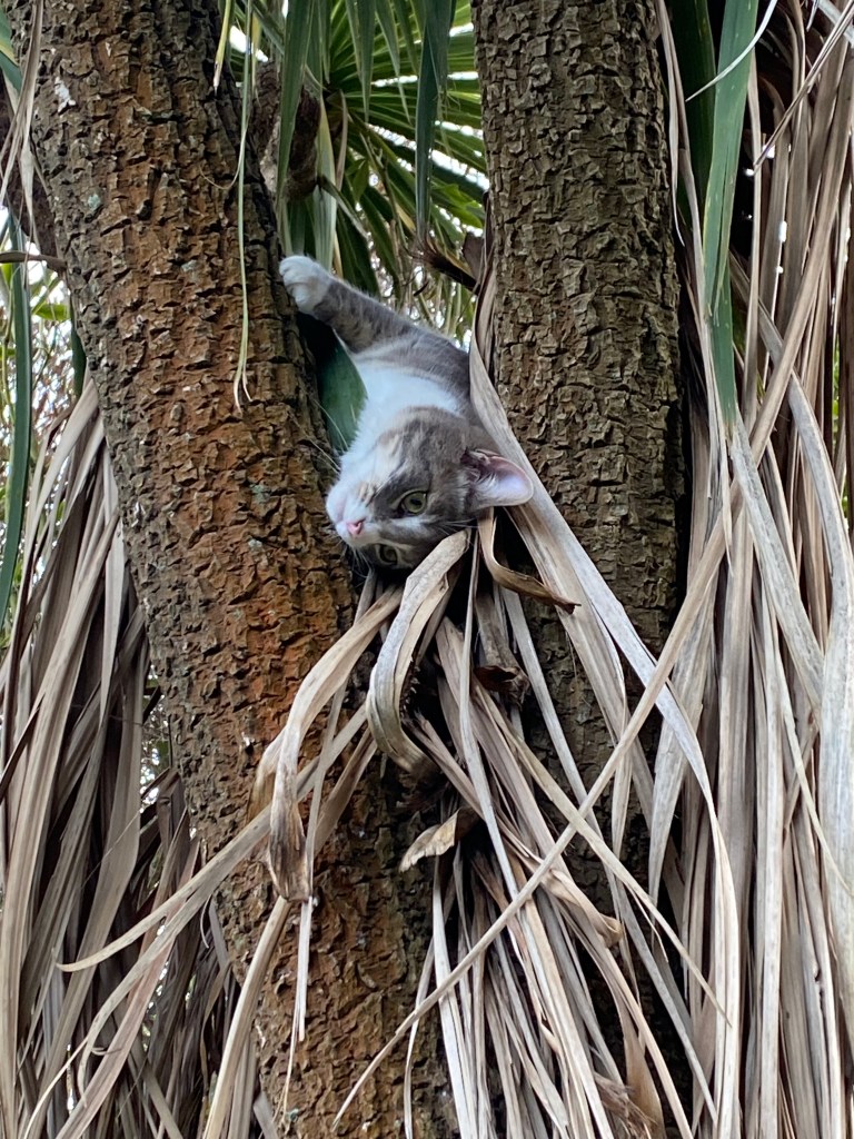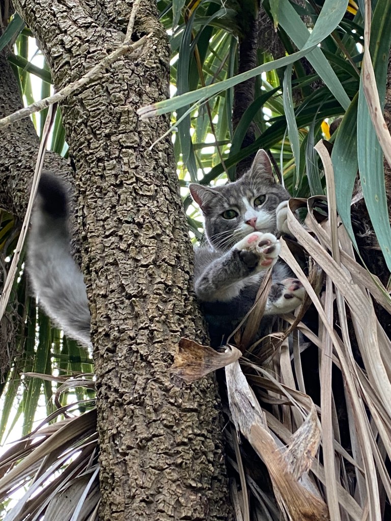 The warm nor’west wind had Felix racing about and then up into the cabbage tree.