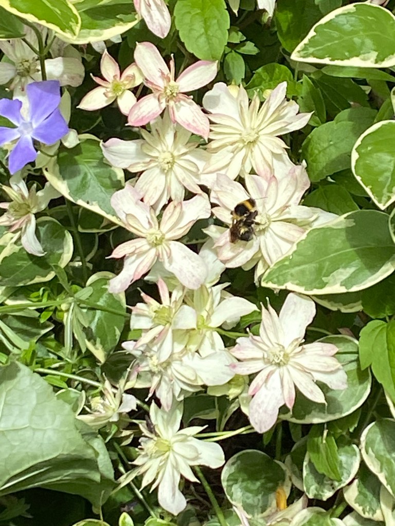 These roses are doing well in pots. The Sexy Rexy was in the garden, but was not thriving. It didn’t take long to recover once it was in a pot. I have a watering schedule: the pots are watered twice a week and fed on alternate weeks (roughly). The liquid plant food smells rich and pungent; the prolific flowers suggest it is doing them good. I’m hoping a Spiced Coffee rose, also rescued from the garden, will do well in its pot. The Violet Hit, which has always been in a pot, was not thriving, so I moved it last summer into a more open position and it is steadily improving, despite the fact that an aquilegia has taken up residence in the pot and will not be budged.