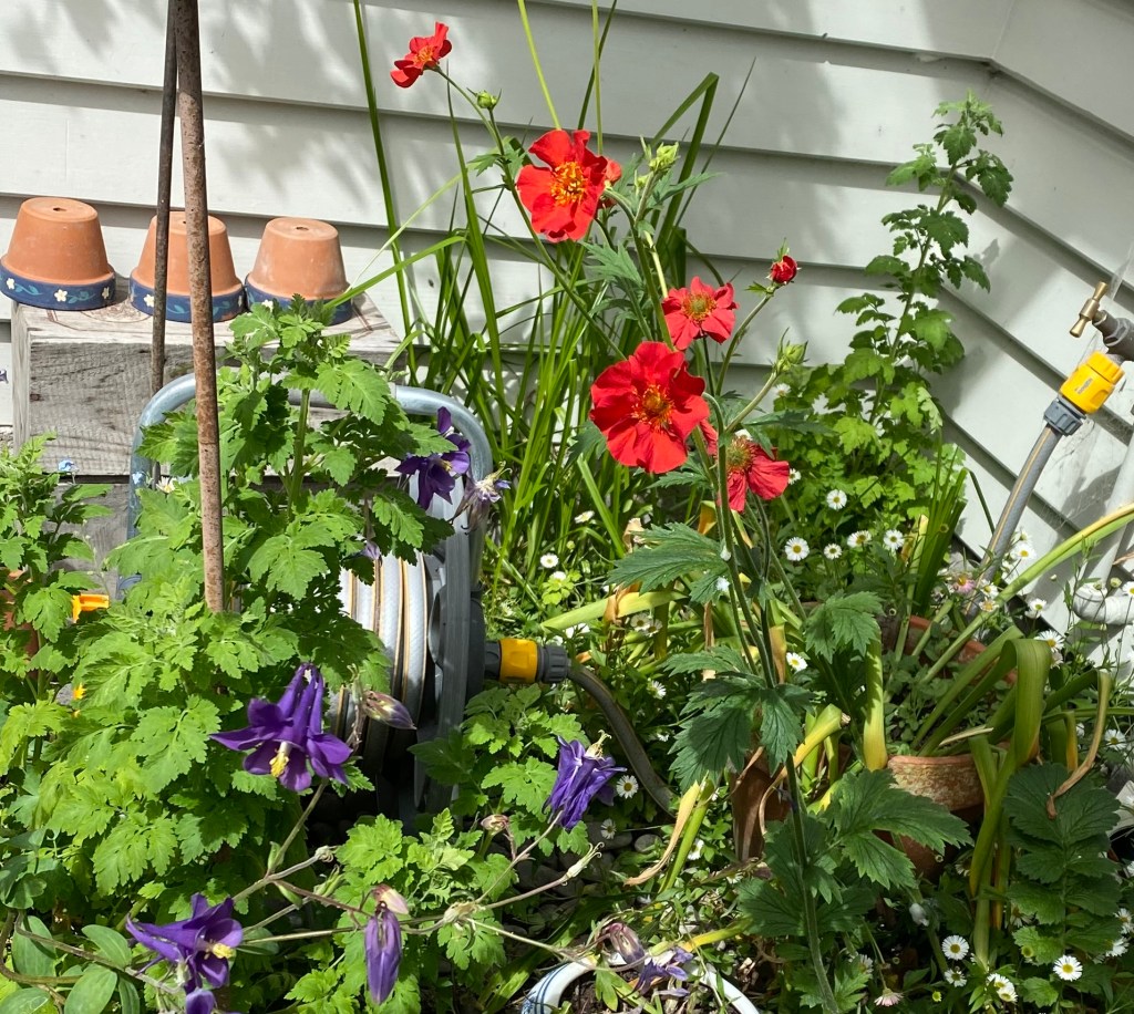 A mass of sweet peas is growing in a barrel. They have simply come up by themselves this year. Popping up amongst them are self-sown poppies – including some fluffy ones – and underneath a little daisy is struggling for light.
