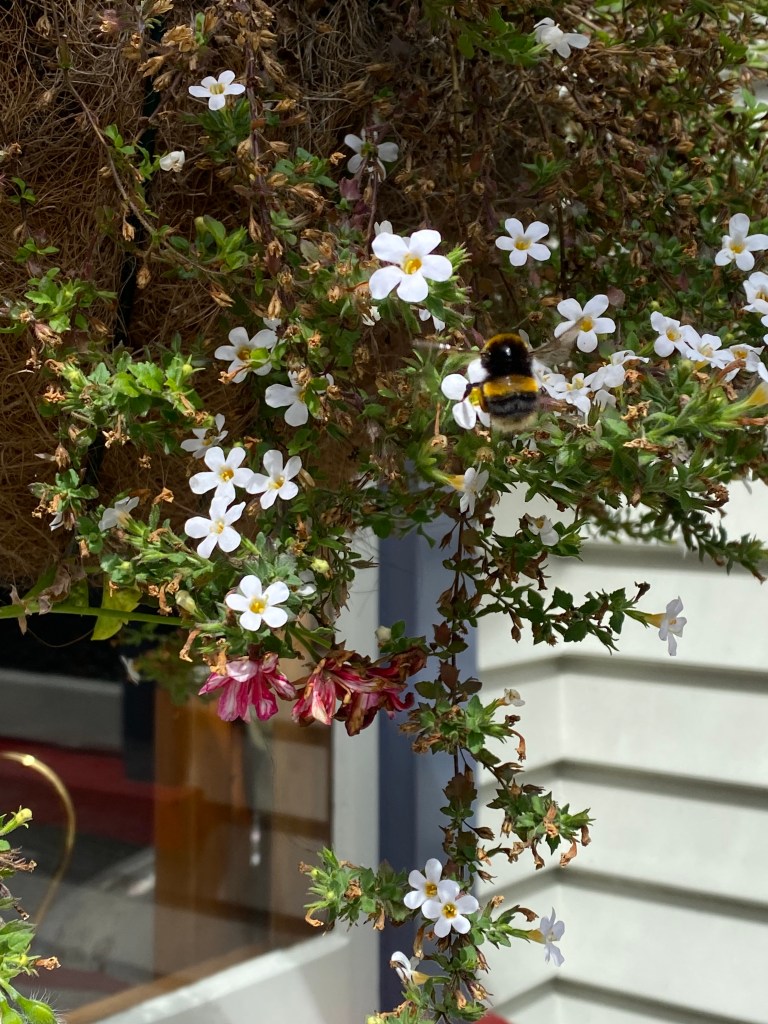 You can hardly see the pot this lime tree is in; the companion plants of alyssum and silver thyme are thriving – a sign of good soil health, I hope. A previous lime tree died, so I decided on a pot for this one, beside the house for shelter. So far so good – and the lime tree has lots of flowers. As with all the pots, I use food suitable for container plants – either liquid or slow release – so that the soil doesn’t build up toxicity, a tip picked up from a television gardening show.