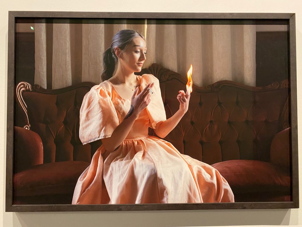 I thought of Mahuika, keeper of fire, who produces fire from her fingernails in the manipulated photograph below. Here, she seems to be about to light her cigarette. Looking more closely, I observed the mis-match (haha) of images – the stiff curtain against a plush replica couch, on which is superimposed the woman with silvered hair and painted thick eyebrows fashionable with young women now, wearing a clumsily-made formal (bridesmaid’s?) 1980s dress. She has a calculating look on her face, and is she making a rude gesture? Revenge is one of the themes of the series of photos of which this is one. Ancient power defying modern expectations of femininity could be one interpretation.
