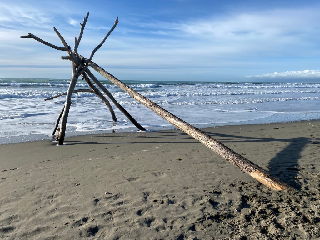 At the beach, a driftwood sculpture seems to point to stars on the horizon.