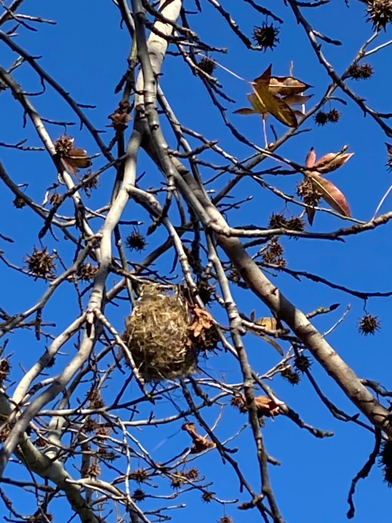 A tree near my house has star-shaped leaves which move in the wind as if they are twinkling like stars. The tree has spiky fruit. I noticed a tiny hanging nest high in the branches. It is smaller than a tennis ball.