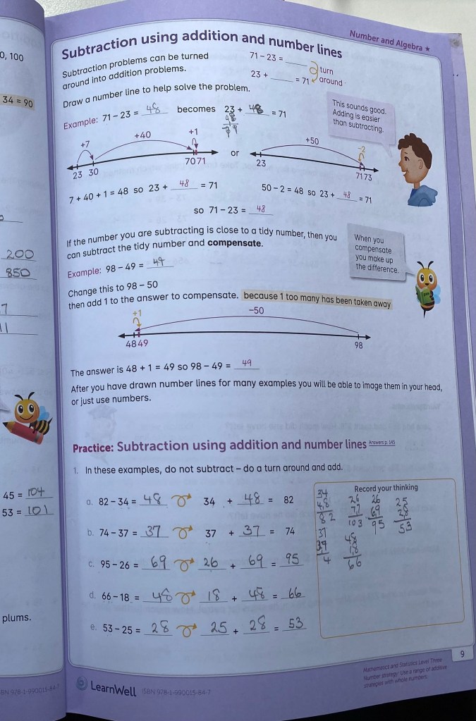 Who knew you could turn subtraction into addition? Everybody, probably, except me! The ‘Addition using an algorithm’ however (despite the use of the word ‘algorithm’) was the way I learnt addition at school. It was called ‘carry one’ then – now it’s ‘renaming’ (a one becomes a ten, etc). Also, putting the renamed number at the top of the next column makes it harder to overlook than putting it at the bottom of the column, as I was taught.