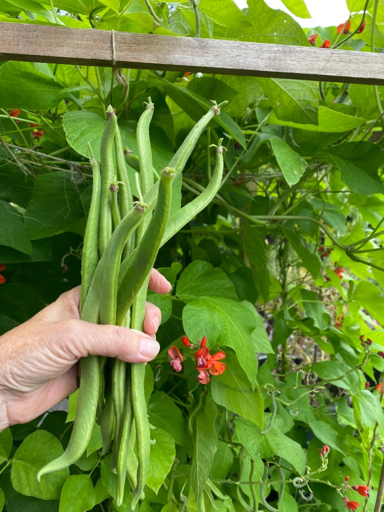 This evening I picked the first of this season’s runner beans for dinner. I was afraid that I’d left them too long, but there were no strings and they were delicious.