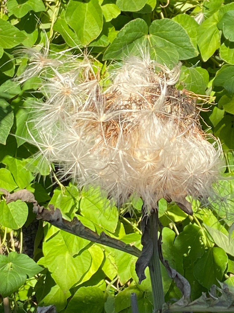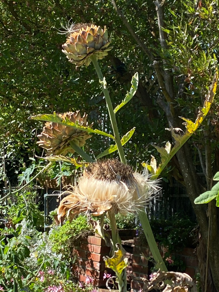 Artichokes are a type of thistle, apparently. I anthropomorphise my artichokes because they look as if they’re waving their arms about. The one which ‘exploded’ in a cloud of thistledown the other day is increasingly earning the name ‘Boris’.