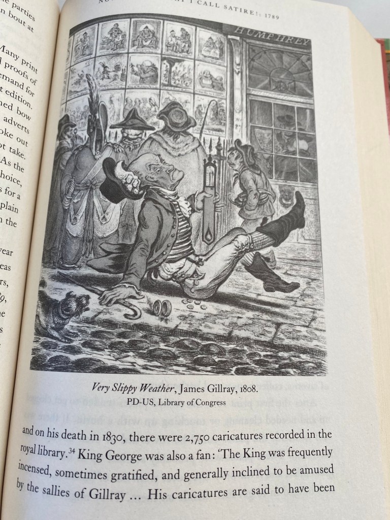 Two hot days in a row were all the excuse I needed to sit in a cool spot and read. Consequently, I’ve just finished this brilliant, entertaining and educative book by a 27 year-old historian. I had thought of skimming through it quickly, but it was so engaging that I read every word – sometimes more than once! The author would like to rescue the once famous (infamous?) visual satirists (mainly Gillray, Rowlandson and Cruikshank) from Victorian censorship – Prince Albert burnt many he found in the royal collection. She claims that they were such an influence in their time that they likely changed the course of history. As the cover illustration shows, they caricatured political figures, here showing PM William Pitt and Napoleon Bonaparte carving up the globe – you could substitute them for Trump and Putin.