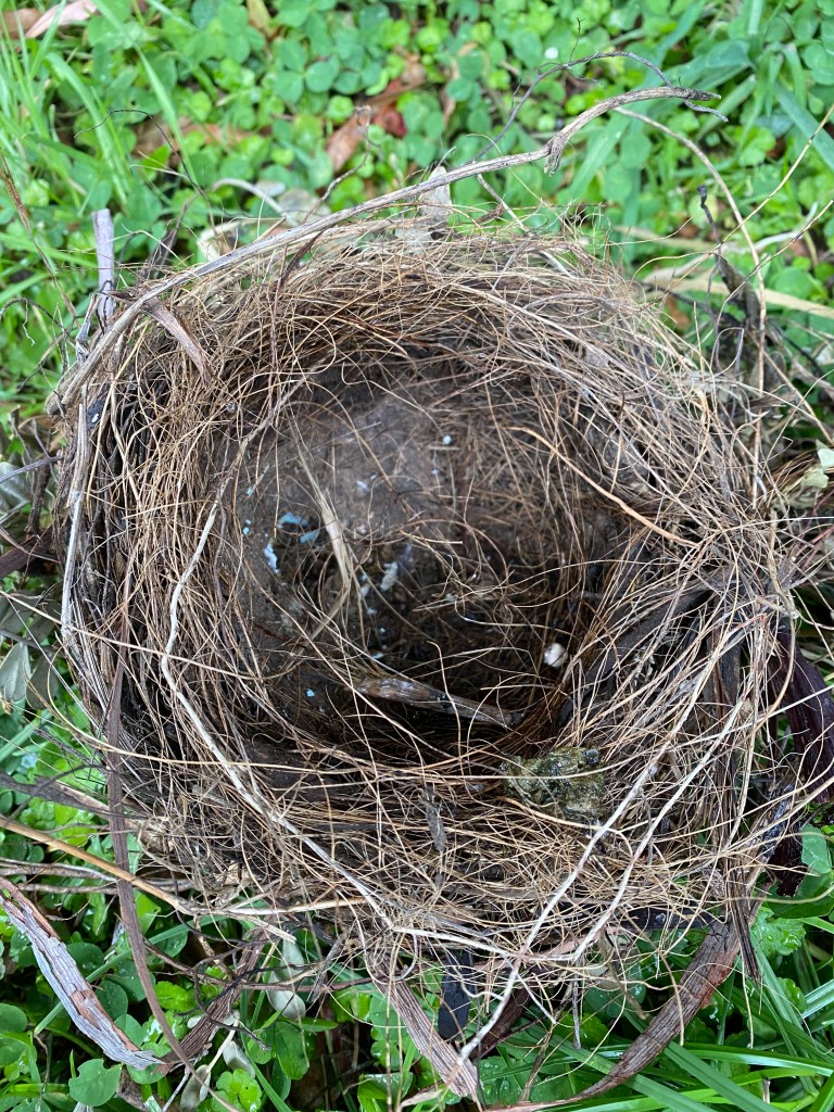 I can identify leaves from akeake, kōwhai, karo and tī kōuka (cabbage tree), as well as dried flower stalks, from the garden. The size of the nest, its heft, the use large pieces vegetation in the construction, and the colour of the eggshell fragments indicate that it is a blackbird’s nest.