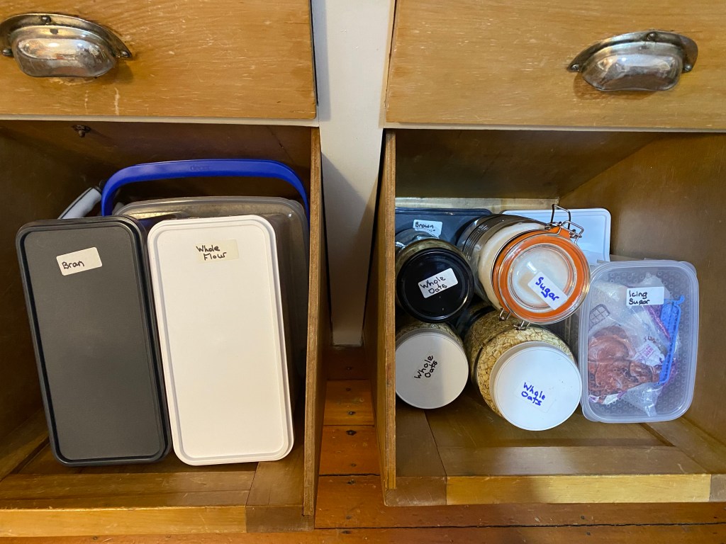 I was in a frenzy of activity today having discovered weevils in a new, unopened packet of wholemeal flour. Closer investigation found them in the bran and the plain flour – and an unopened bag of sugar. It’s not a good feeling to throw food out, but not a good feeling to pretend the bugs aren’t there and use the food anyway! Particularly if you’ve researched the bugs and seen the pictures – magnified a million times. Yuck. At least the food could go in the compost. Then I lifted out the flour bins, cleaned them and dried them in the sun, vacuumed and disinfected the whole space behind, sprayed for insects, put down diatomaceous earth for good measure, and went shopping for airtight containers – and supplies to fill them.