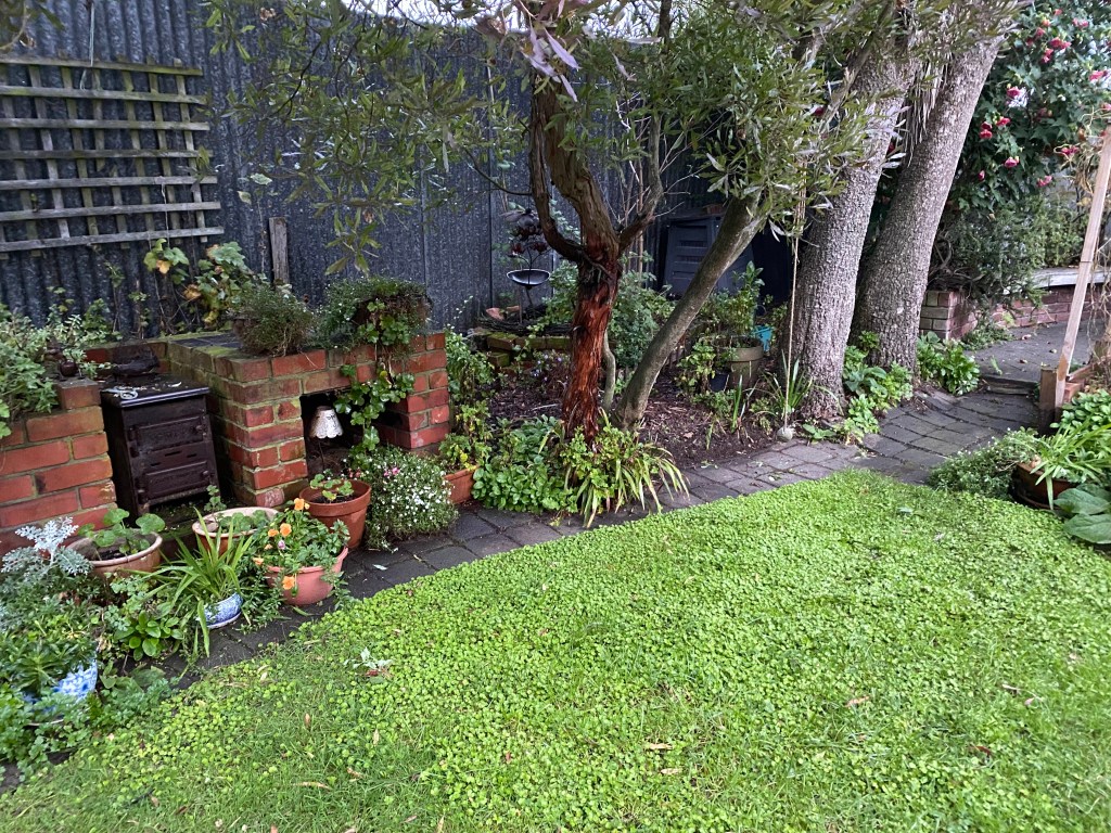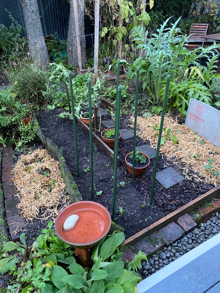 I bought three varieties of thyme (lemon, golden and common) and put them in terracotta pots to go alongside the stepping stones which I’ve put through the centre of the vegetable patch. I’ve widened the garden by moving the brick edging further into the lawn. It felt creative, deciding to add some stones here, bark mulch there, and some old boards as edging. Pea straw around the chard and kale added the rustic look I like – and it smells wonderful!
