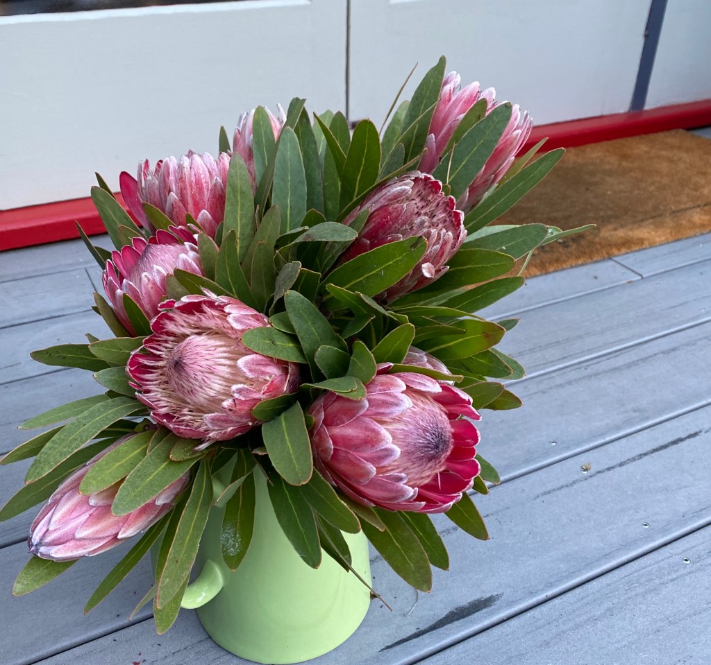 It was a chilly start to the day: minus three degrees. A bird bath, overflowing from recent rain, was frozen solid. It looks as if my lettuces have succumbed to the cold, while the proteas are doing just fine outside. I put them outside the back door when I discovered ants in the flowers. These ones were cut down by the arborist last week and I rescued them before they could be put through the mulcher. I guess the ants were attracted to their nectar while they were down on the ground. I saw proteas for sale at $3.99 per stem this week – even without bonus ants.