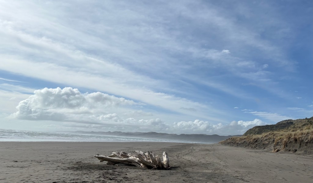 Clouds over Ngarunui Beach One of four stone carvings of the elements