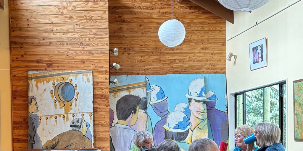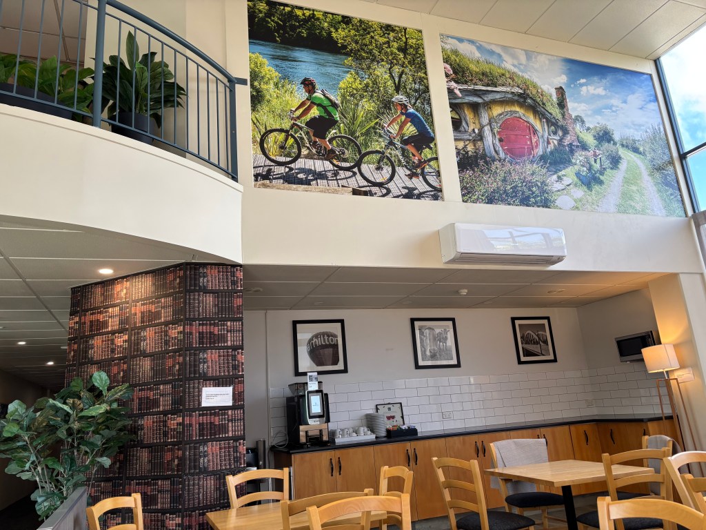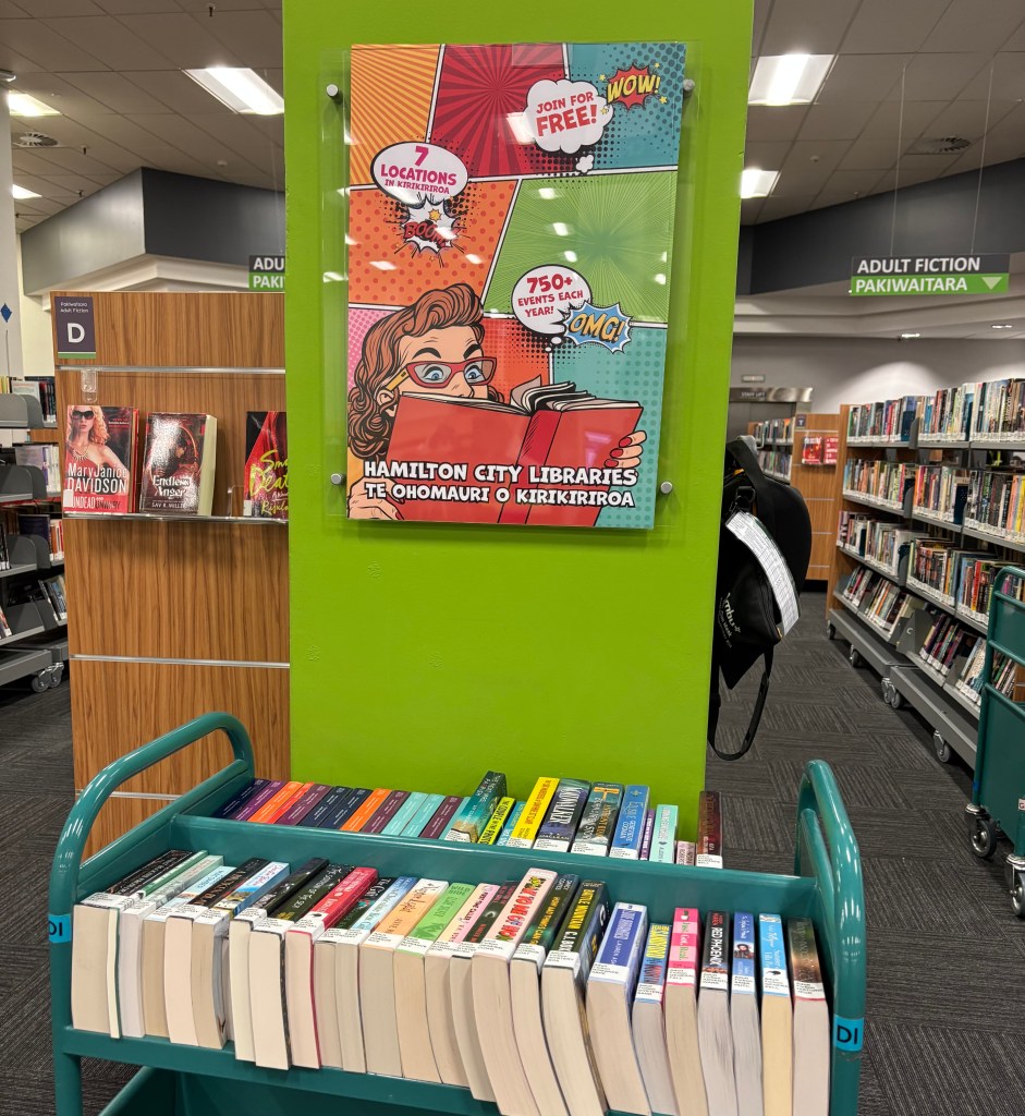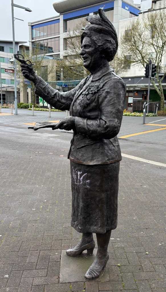 Other snippets from Hamilton include a glass of wine I enjoyed at The Bank (with a bowl of seafood chowder), the statue of Dame Hilda Ross (so unusual to see a statue of a woman politician), and a colourful photo from the Hamilton Library. There was no natural light in the library, so I hope the alterations in progress at the front include huge windows facing out onto Garden Place.