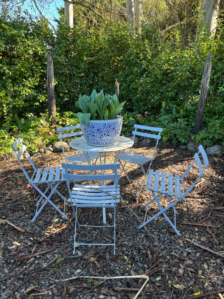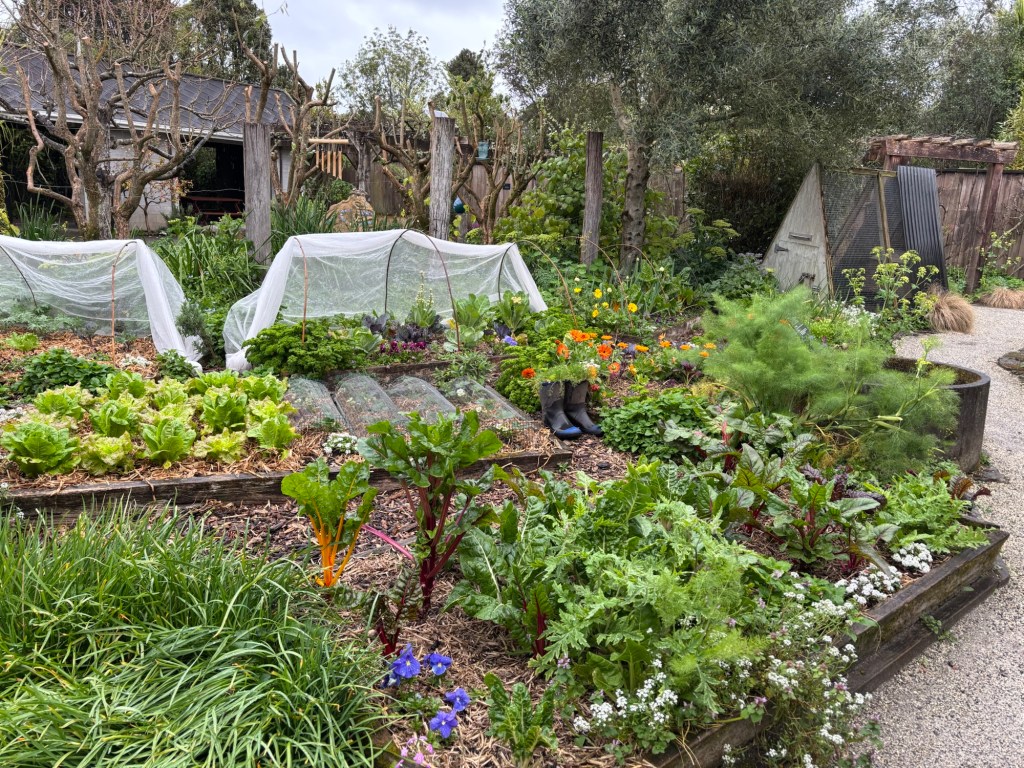 There are chooks and a marvellous garden shed. Dotted about are places to sit, including a gorgeous glasshouse with a chandelier.