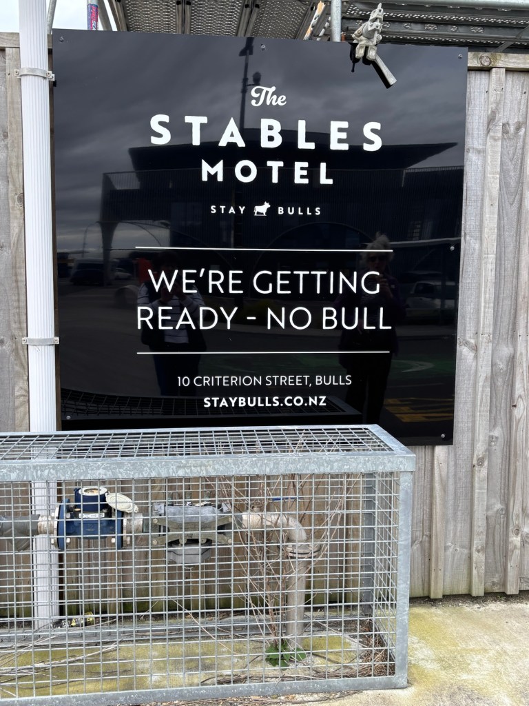 On the bus tour I was intrigued by the numerous corrugated iron figures, such as the perched pukeko, as we drove through Tirau, and wall paintings at Trelinnoe Park. I sought out Wardini Books in Napier, having read the two crime fiction books the owners, Gareth and Louise Ward, have co-written and set in their second book shop in Havelock North – which I also saw as we drove through.