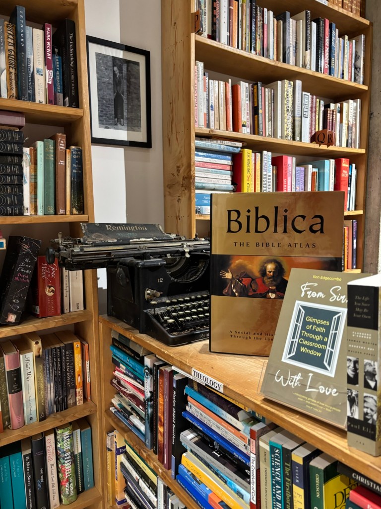 Travel booksThere are a few old typewriters Book bike in the laneThe books spill over into the adjoining café