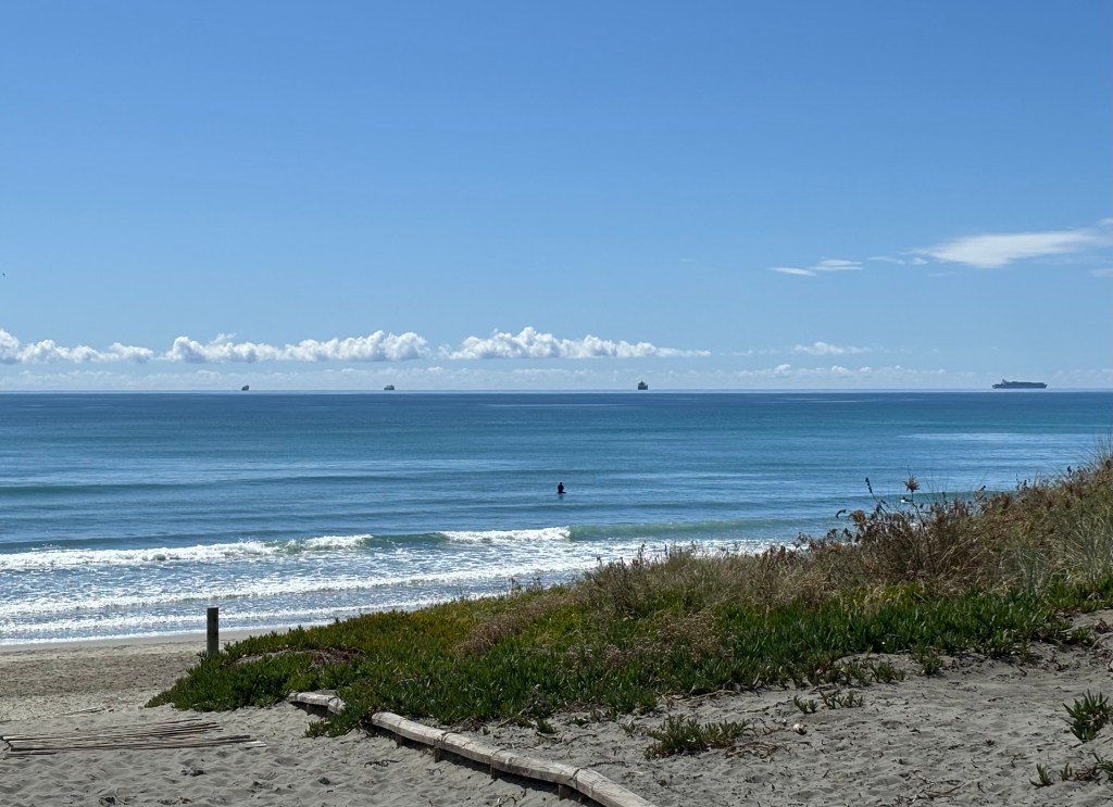 This photo is disappointing. The beach this morning was much more vibrant in real life. The ships on the horizon seemed closer. The sea was sparkling and dynamic as the tide came in. And, of course, the photo can’t record the sound of the waves or salt-sea smell. While the scene looks calm, there are clues to the vigorous movement of sand and sea. What looks like an edging to the path was once a handrail and most of the timber slats which mark the path are under the shifting sand.